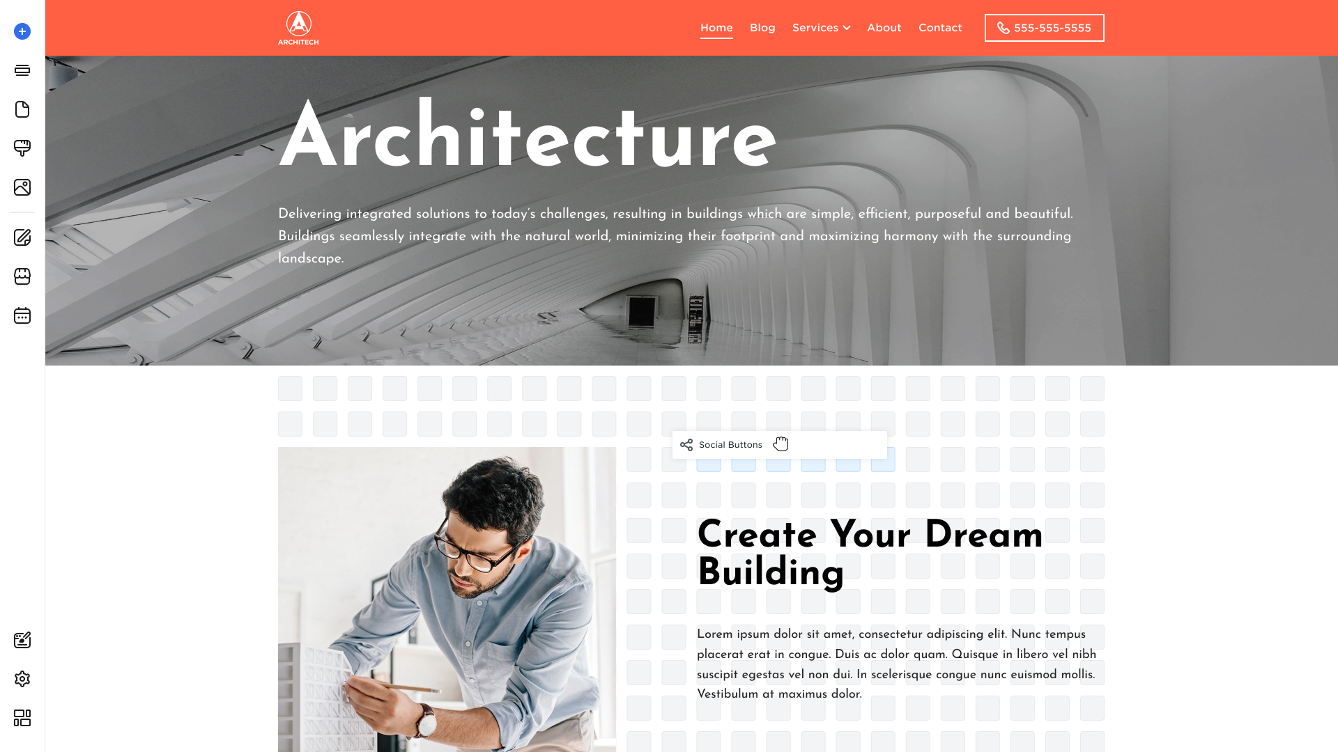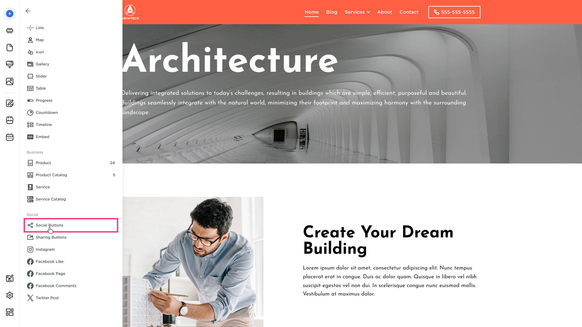- Drag and drop the Social Buttons element into a preferred section: