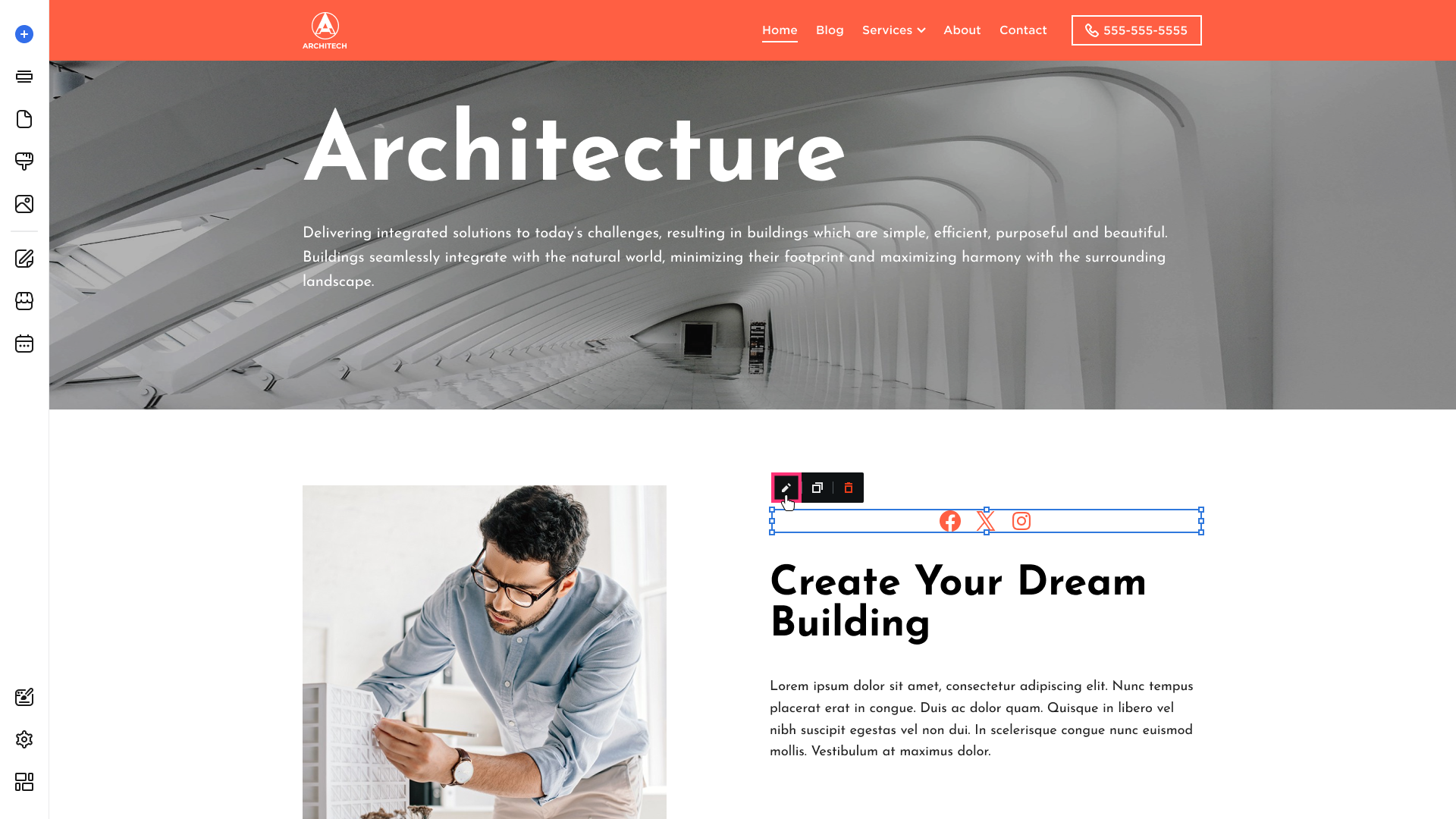 - Hover over the Social Buttons to display the Edit button: