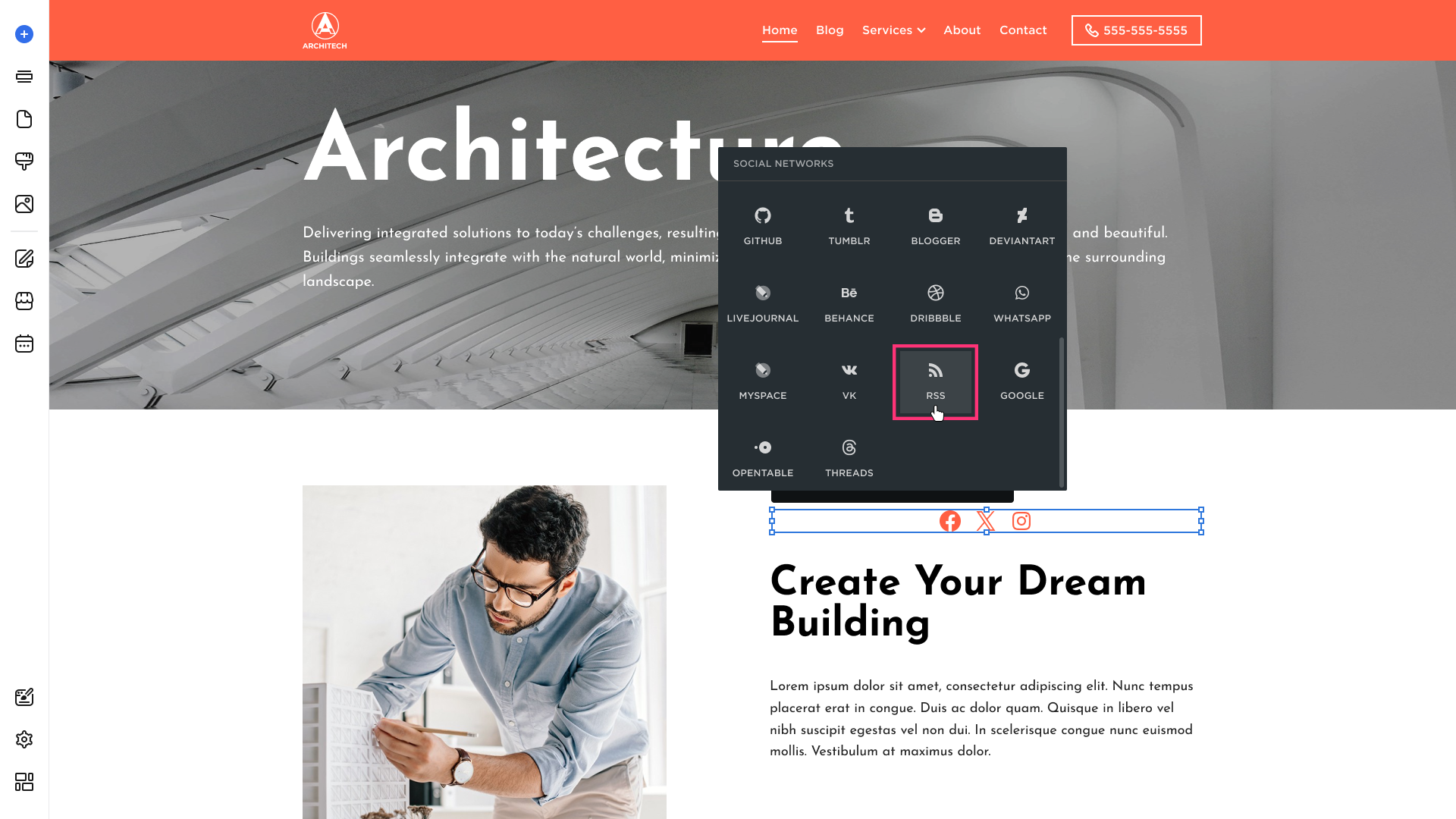 You can add the RSS button to your website via the Social Buttons element: