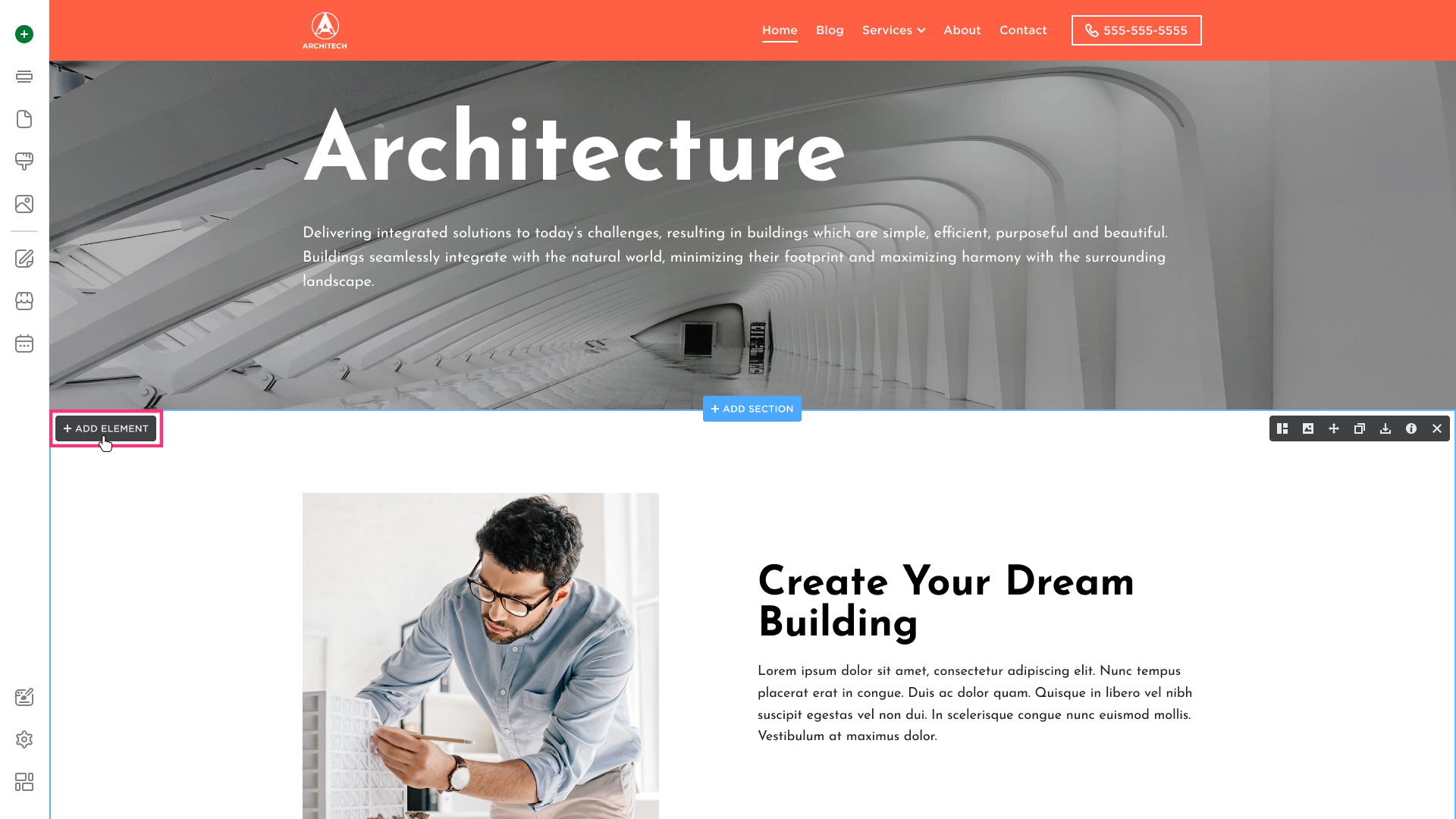 - Hover over the desired section and click Add Element: