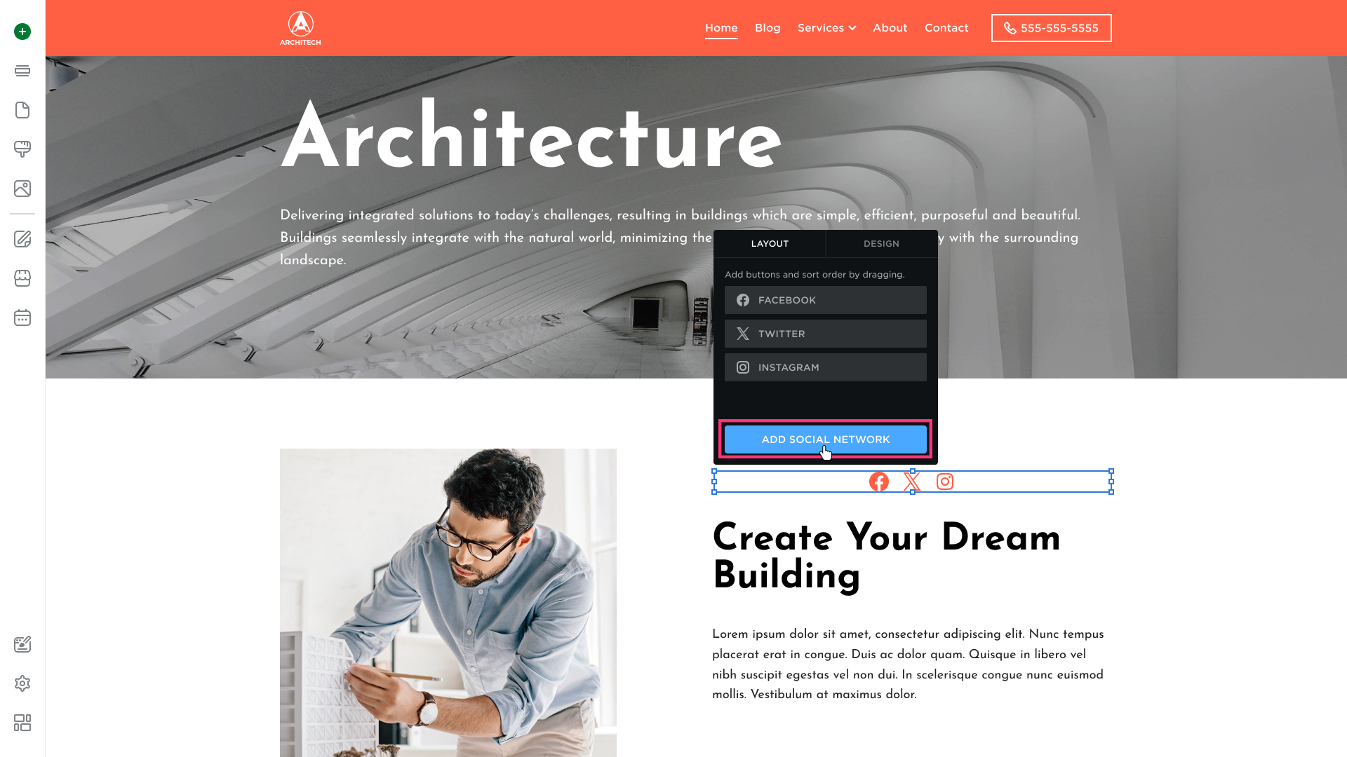 - In the Layout tab, click Add Social Network: