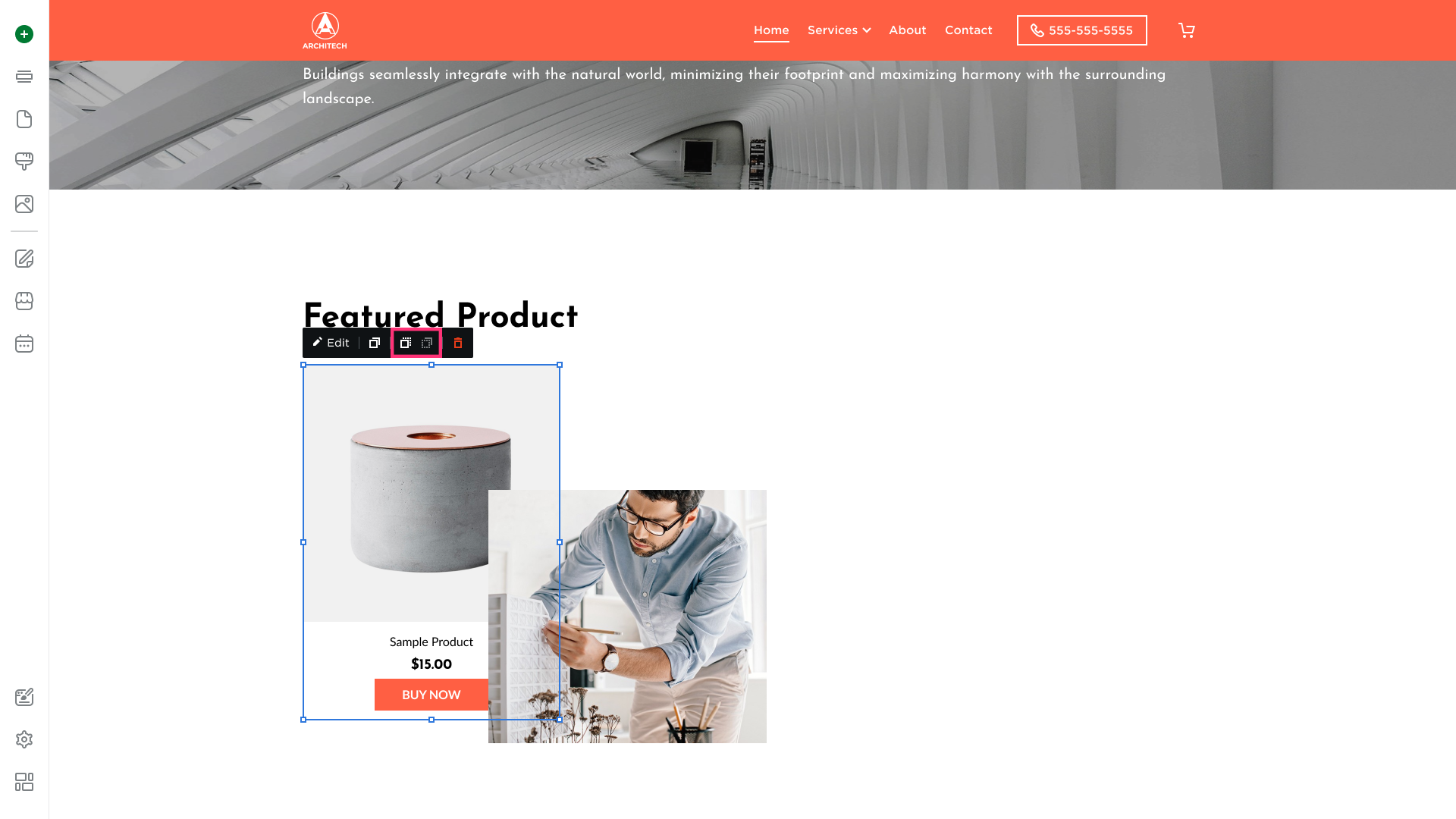 - To duplicate the product, click on the element and choose the Duplicate button that appears in its toolbar:
