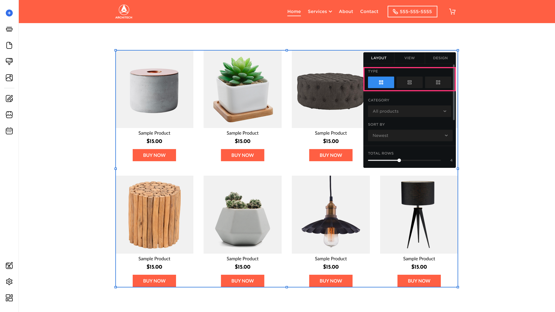 - Layout Type. Select the Catalog Layout among Grid, List, or Masonry: