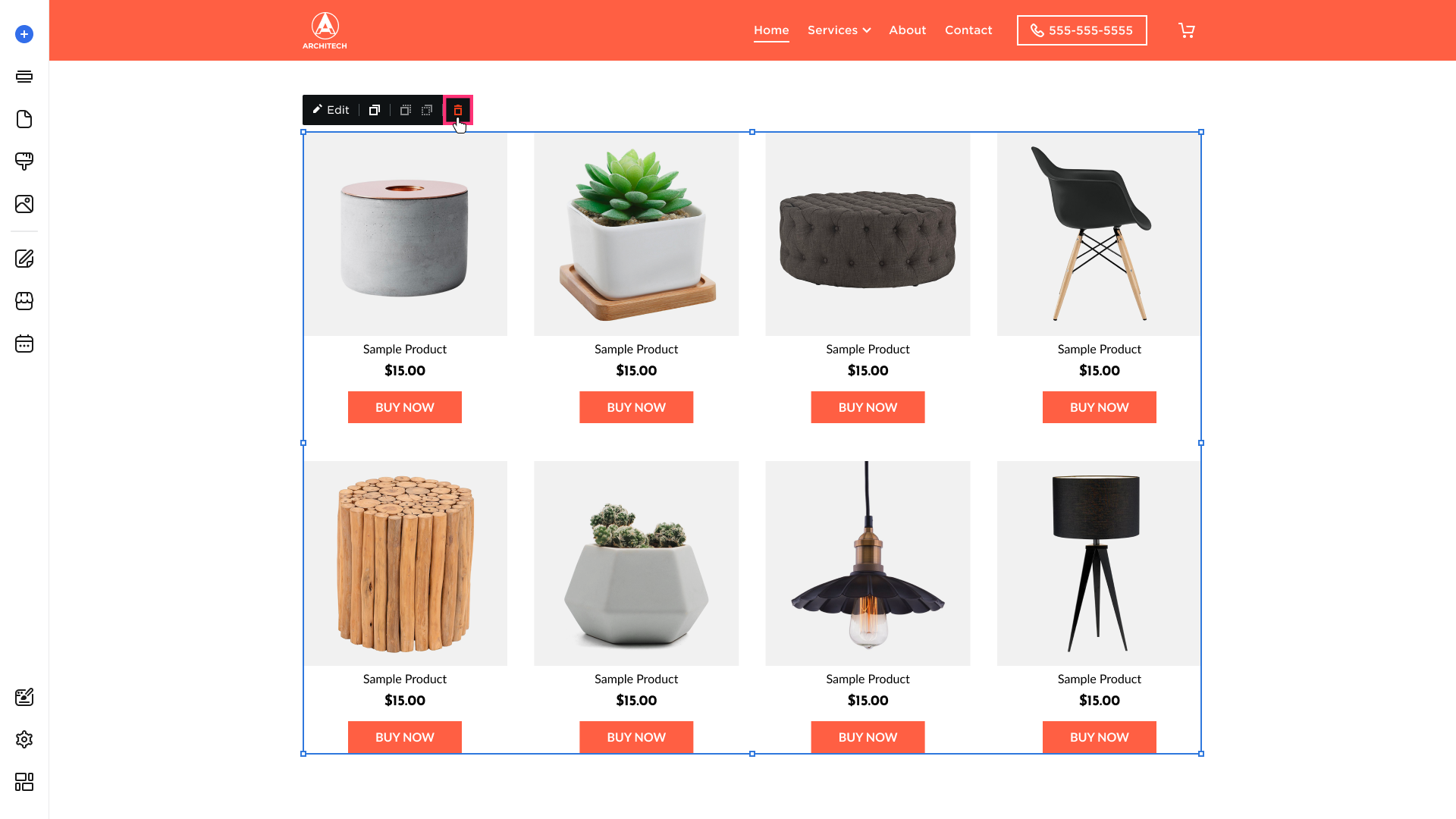 - To delete the catalog, click on the element and choose the Remove button [Bin] that appears in its toolbar: