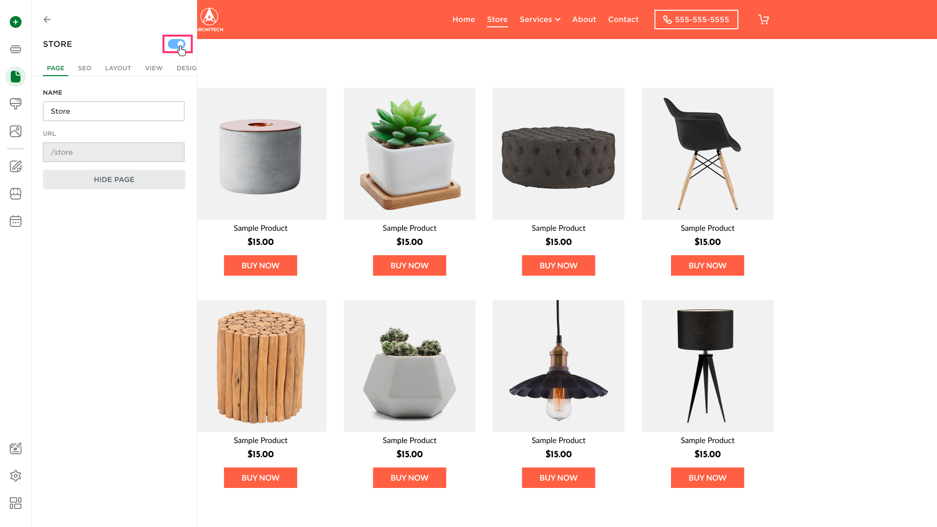 - Hide Page: Click the Hide Page button to remove the page from the navigation menu. Hidden pages can still be accessed through links and appear in the Hidden section at the bottom of the Pages panel. You can also hide a page in the Menu section of the Pages panel if at least one other page is hidden.