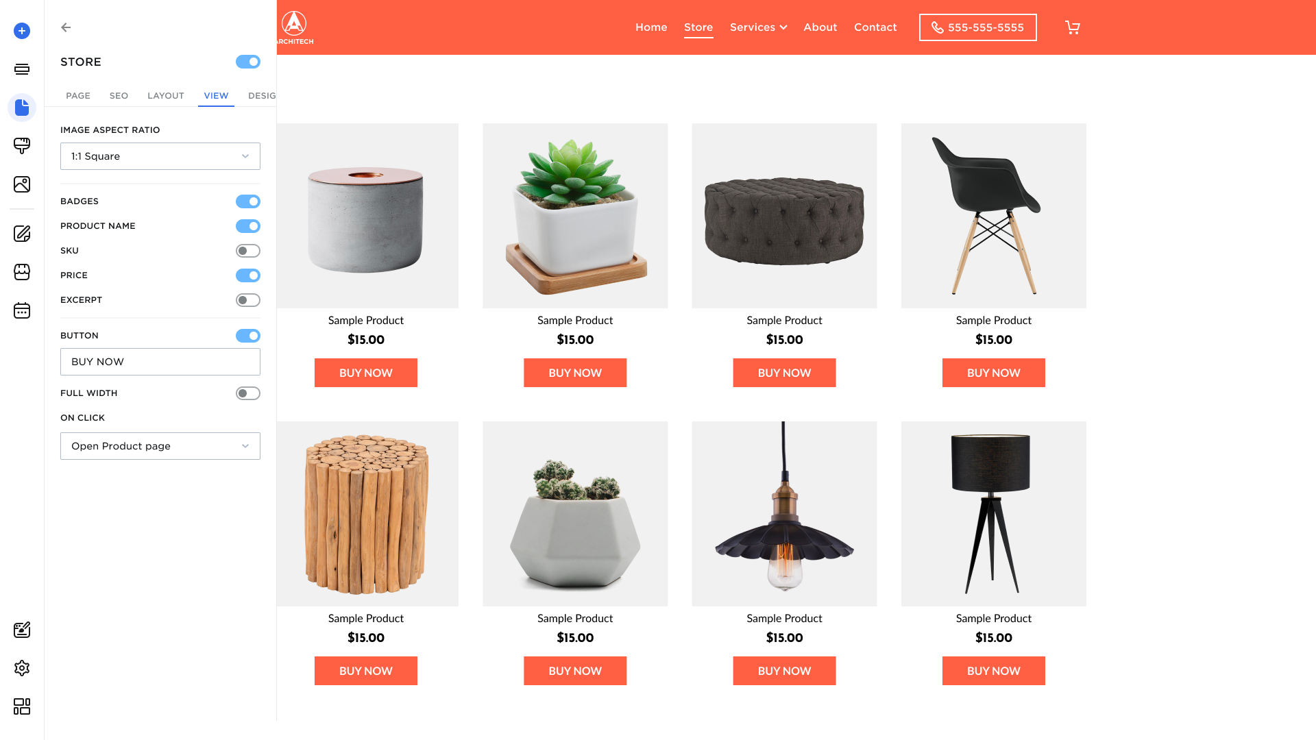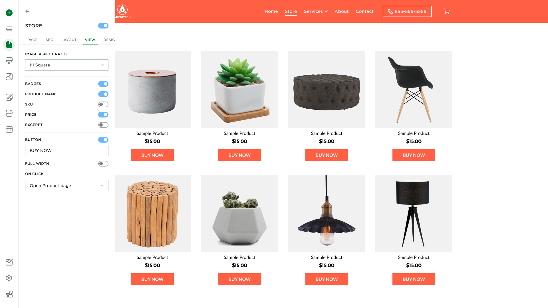- Switches: Determine which product information is displayed on the card (Badges, Product Name, SKU, Price, Excerpt).