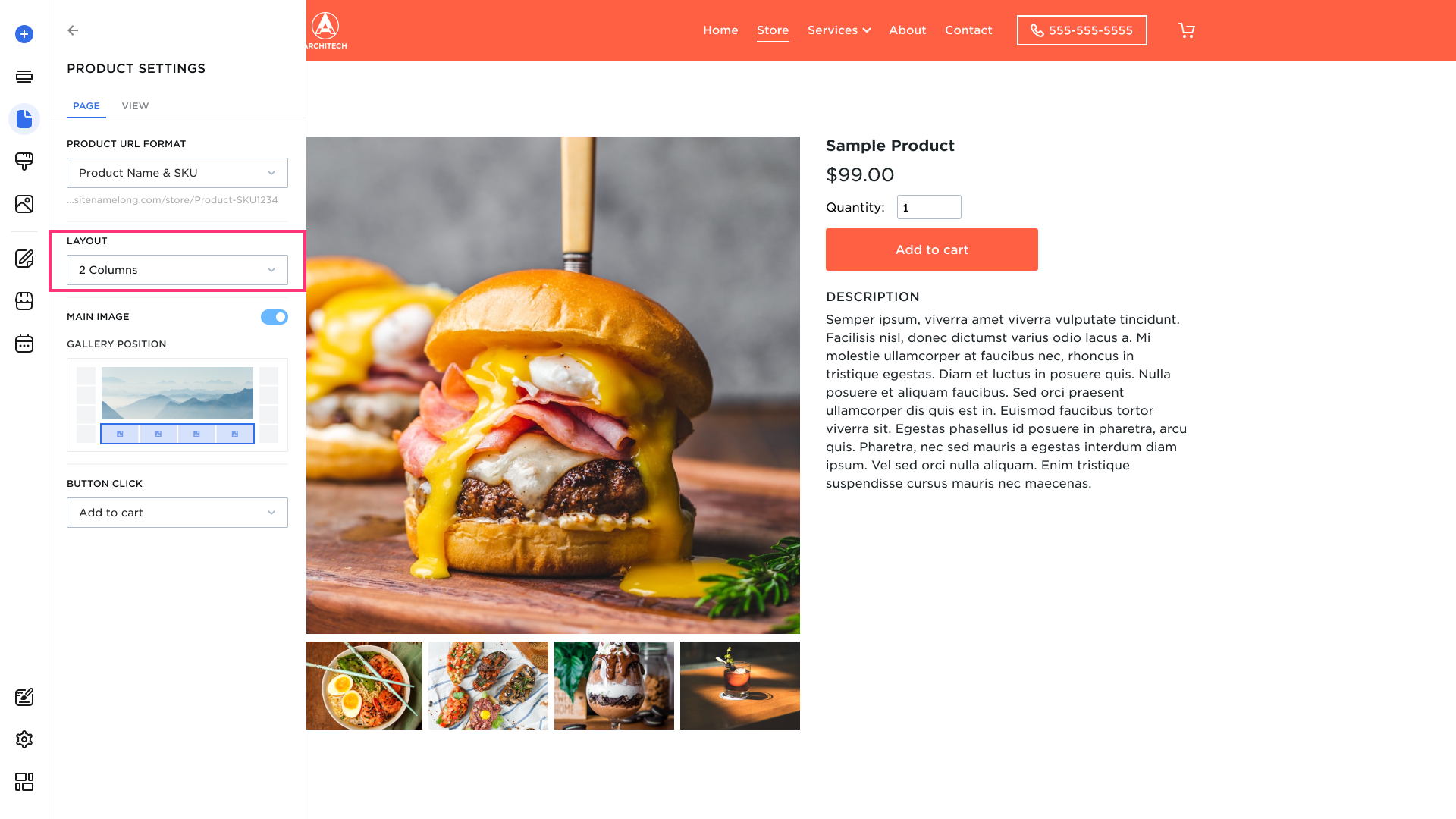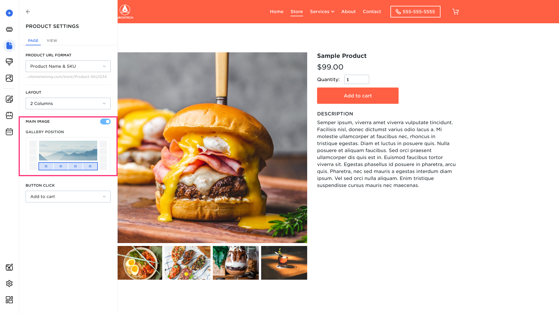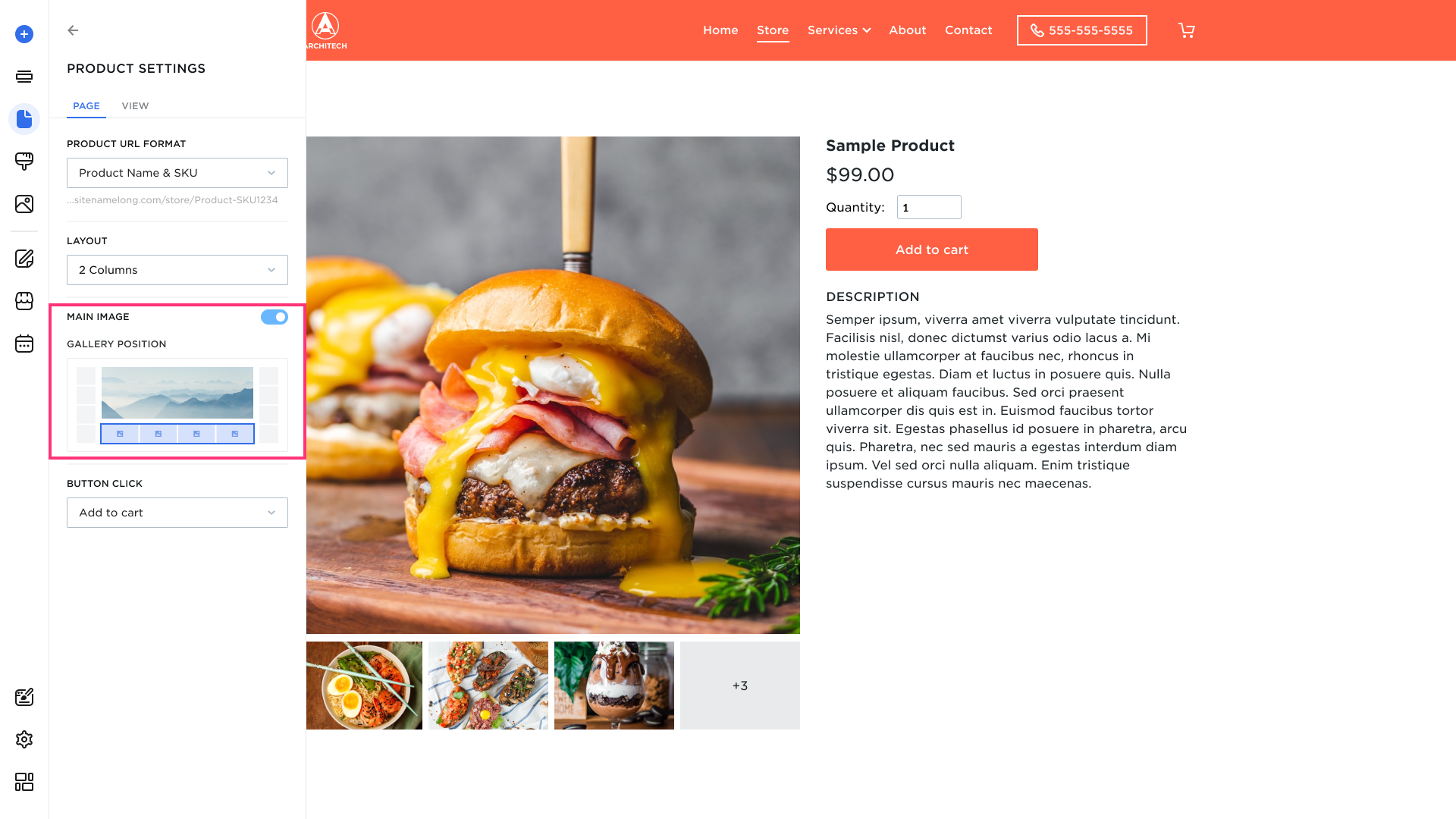 Set the placement of the main image and image gallery. Choose from: Gallery to the left, Gallery to the bottom, Gallery to the right.