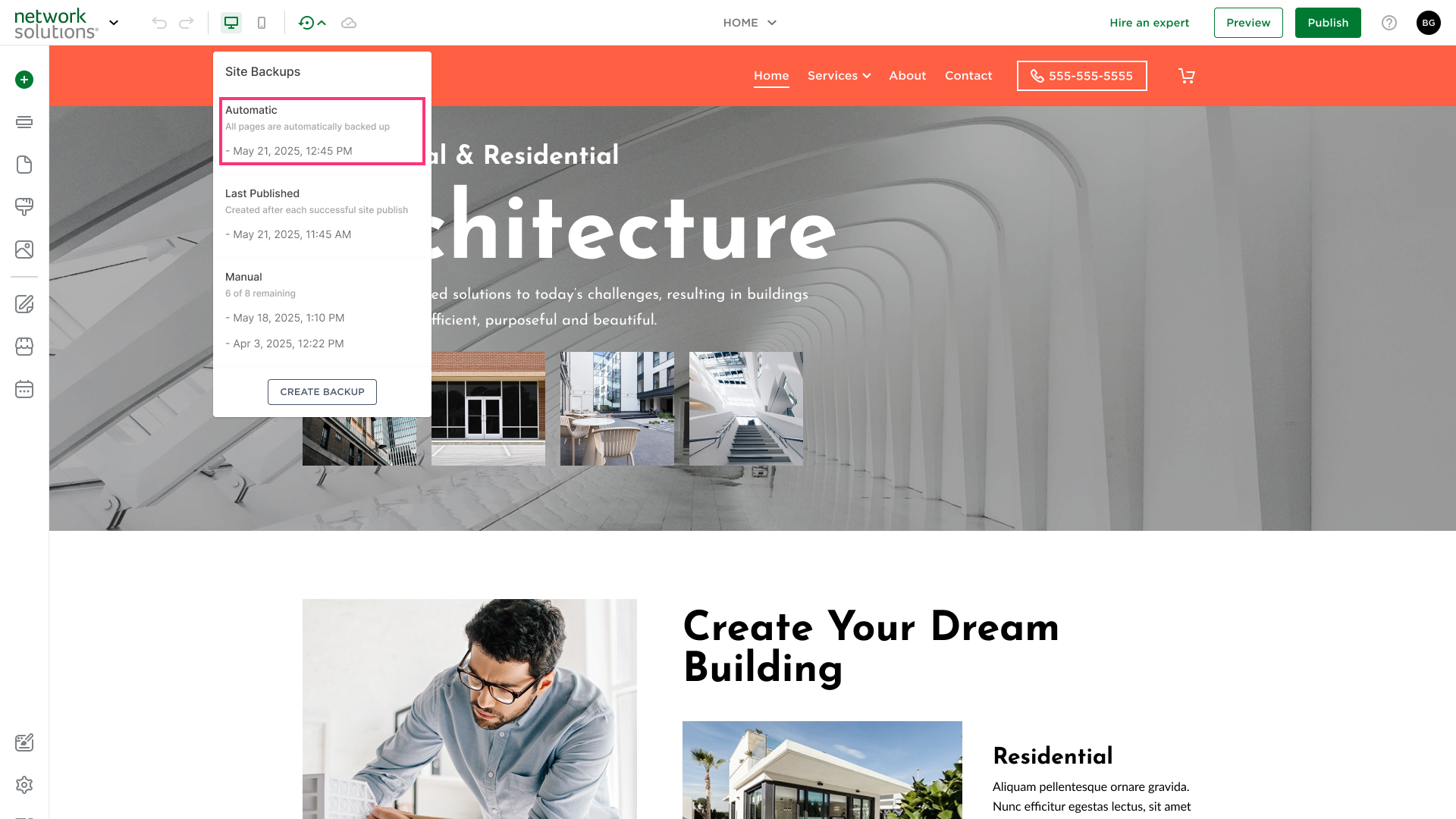 With Site Backups, you can create copies of all your website pages and their content. This feature helps protect your website from accidental mistakes, unwanted changes, or data corruption, ensuring you can always revert to a stable version.