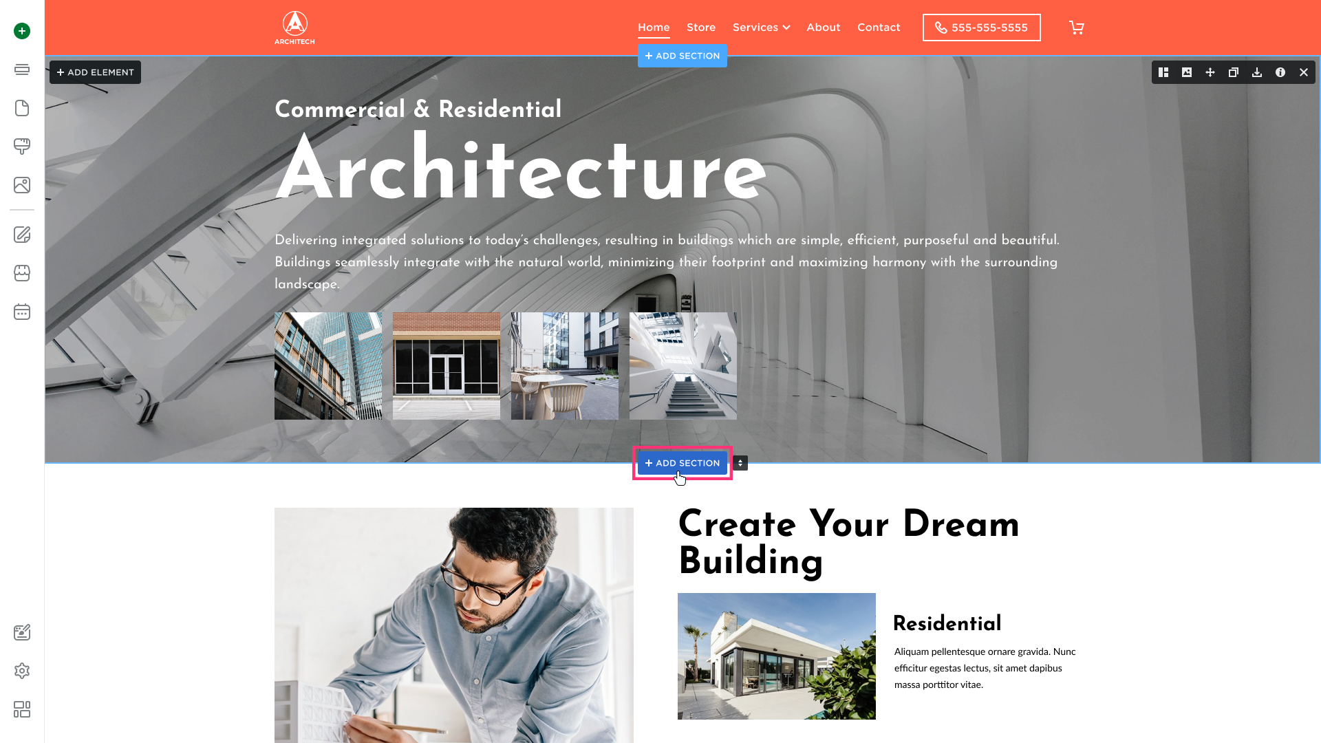 - The new section will immediately appear in the selected area. You can edit and add new elements to it to suit your needs.