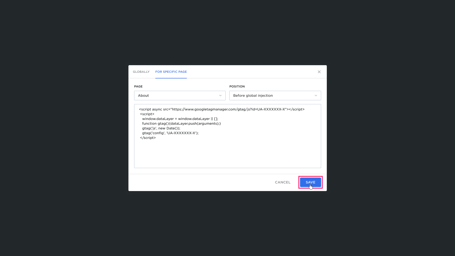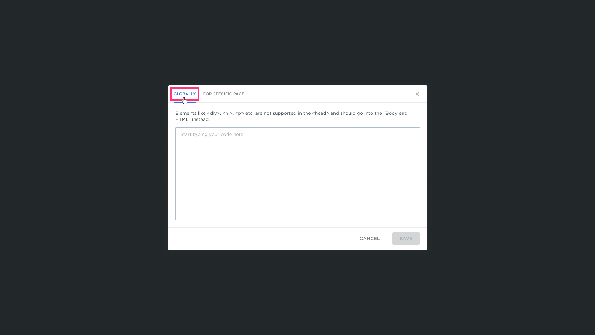 - In the modal window, select Globally tab if you want to add the HTML code to all pages throughout the website: