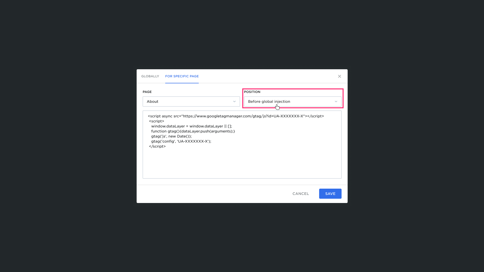 - Depending on the selected position, the HTML code will be added either before or after the global HTML injection code in the page <head> structure.