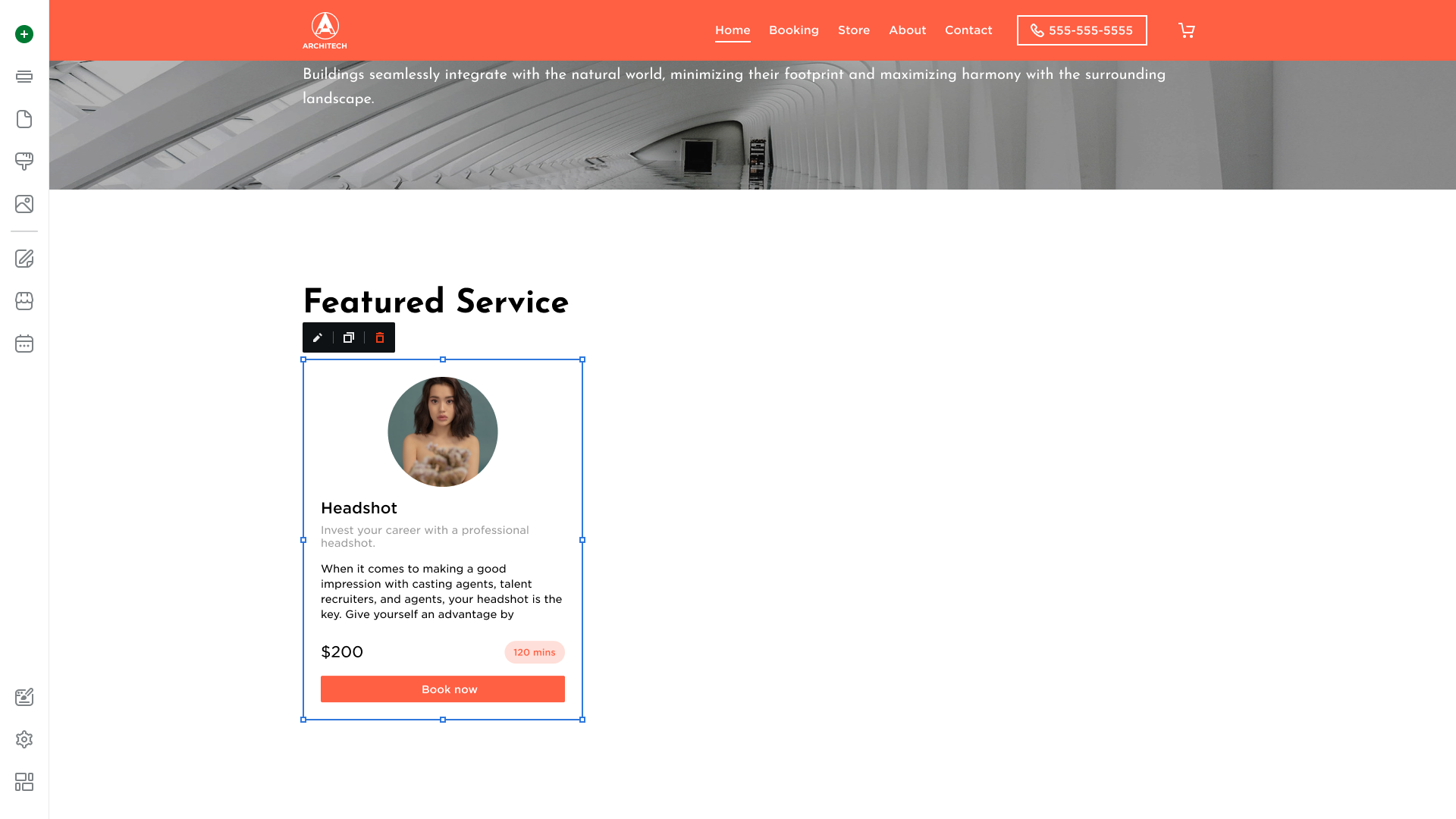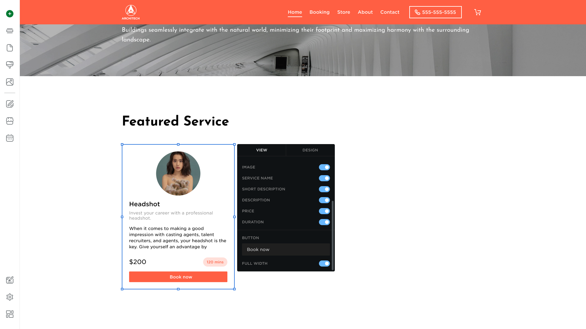 - Switches: Determine which product information is displayed on the card: Image, Service Name, Short Description, Description, Price, Duration.