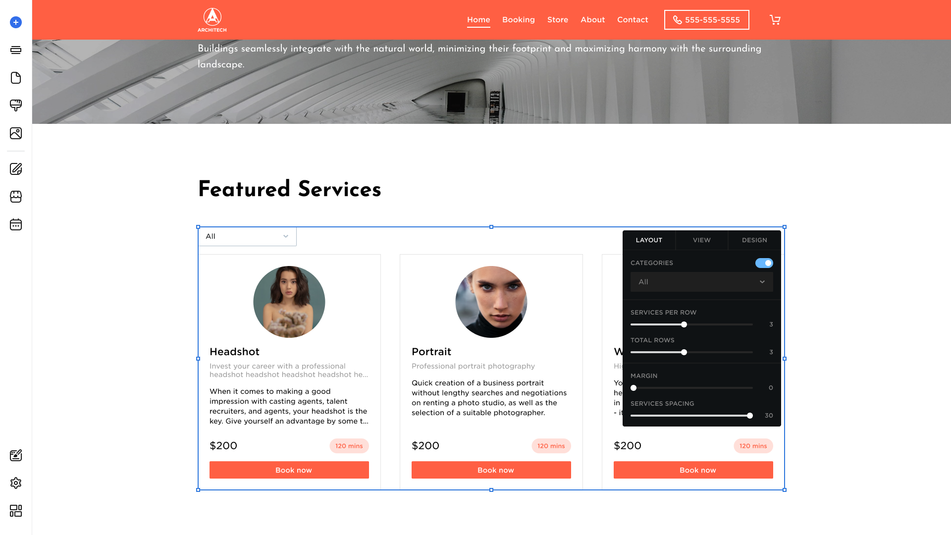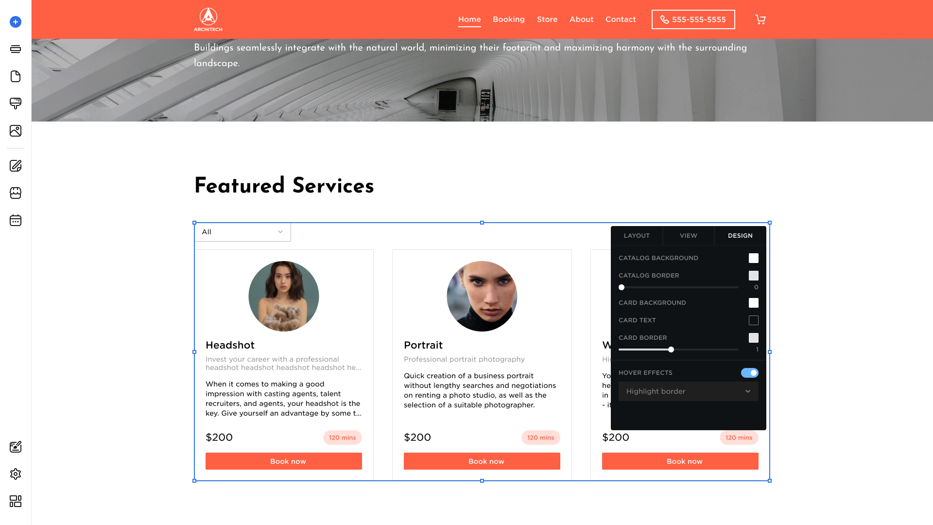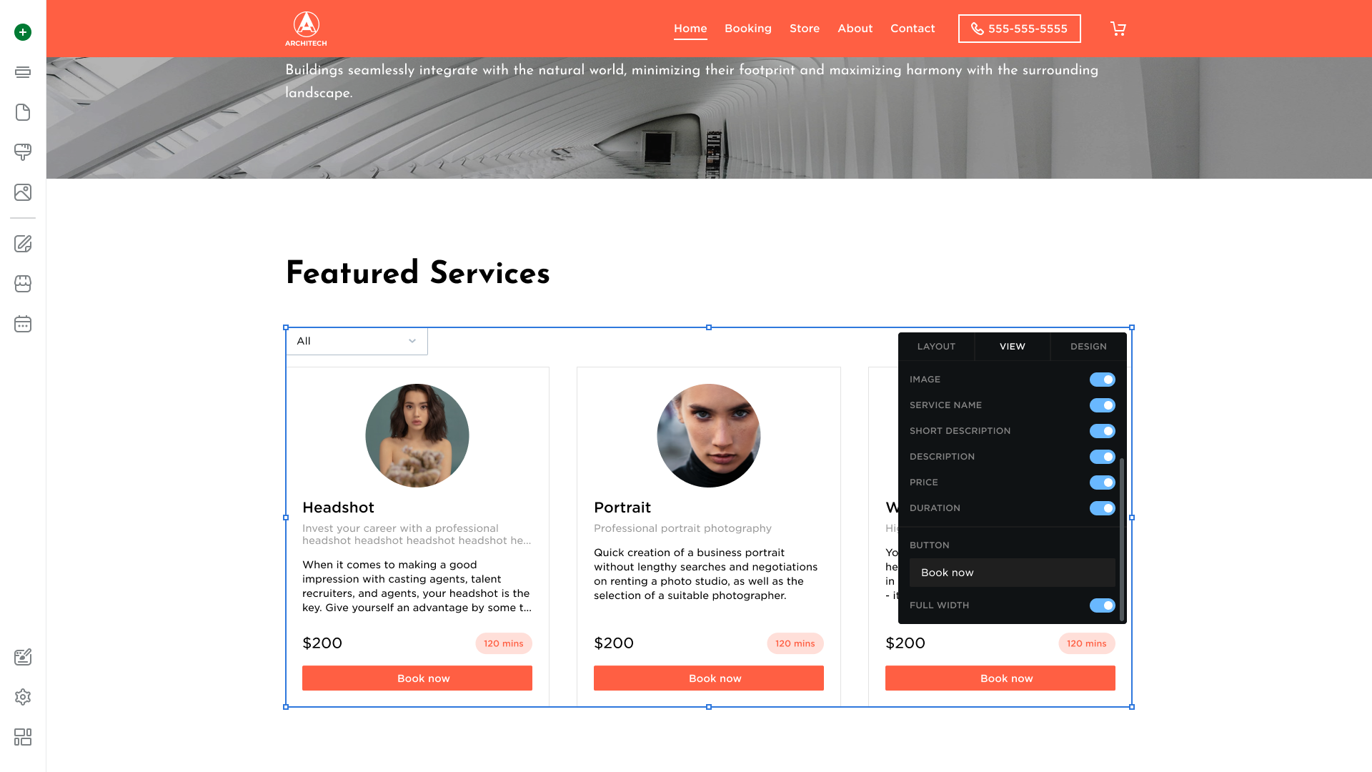 - Switches: Determine which product information is displayed on the card: Image, Service Name, Short Description, Description, Price, Duration.