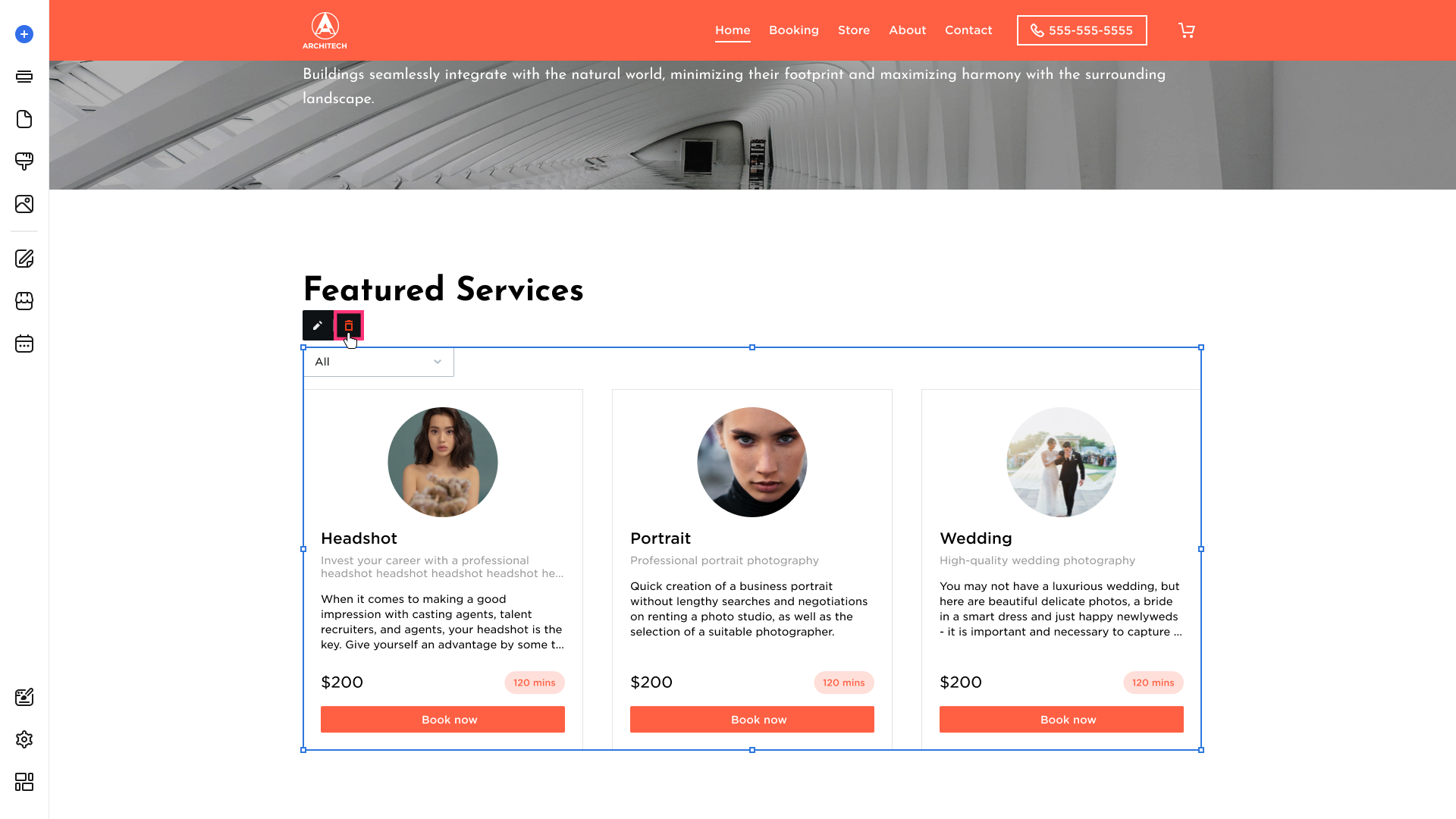 - To delete the service catalog, click on the element and choose the Remove button [Bin] that appears in its toolbar: