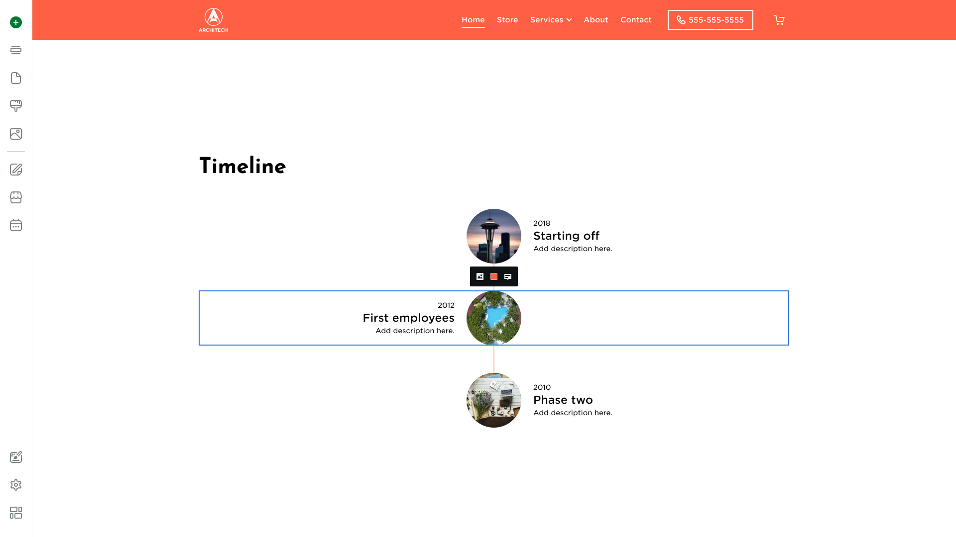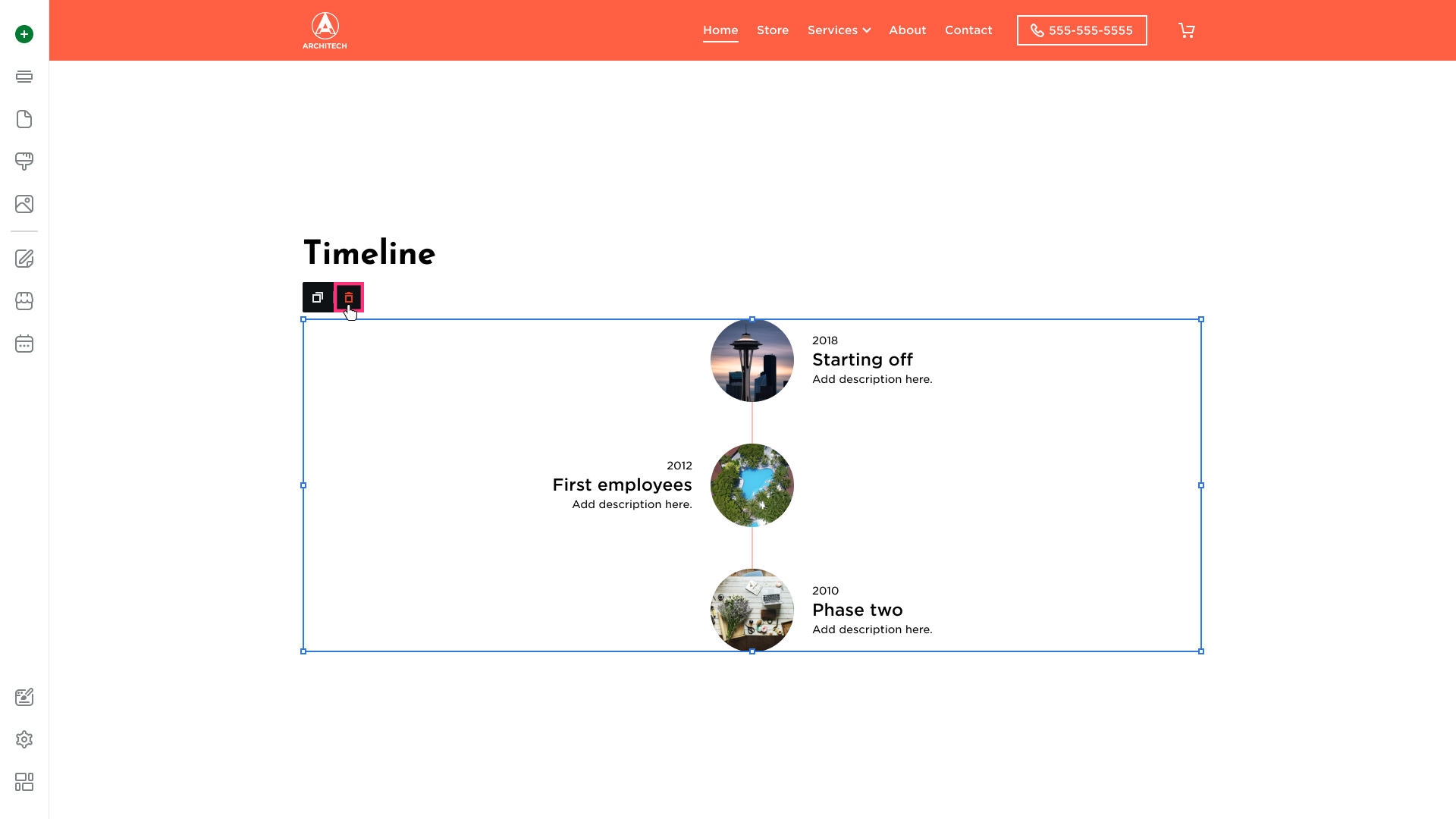 - To delete a timeline item, click on it and choose the Remove button [Bin] that appears in its toolbar: