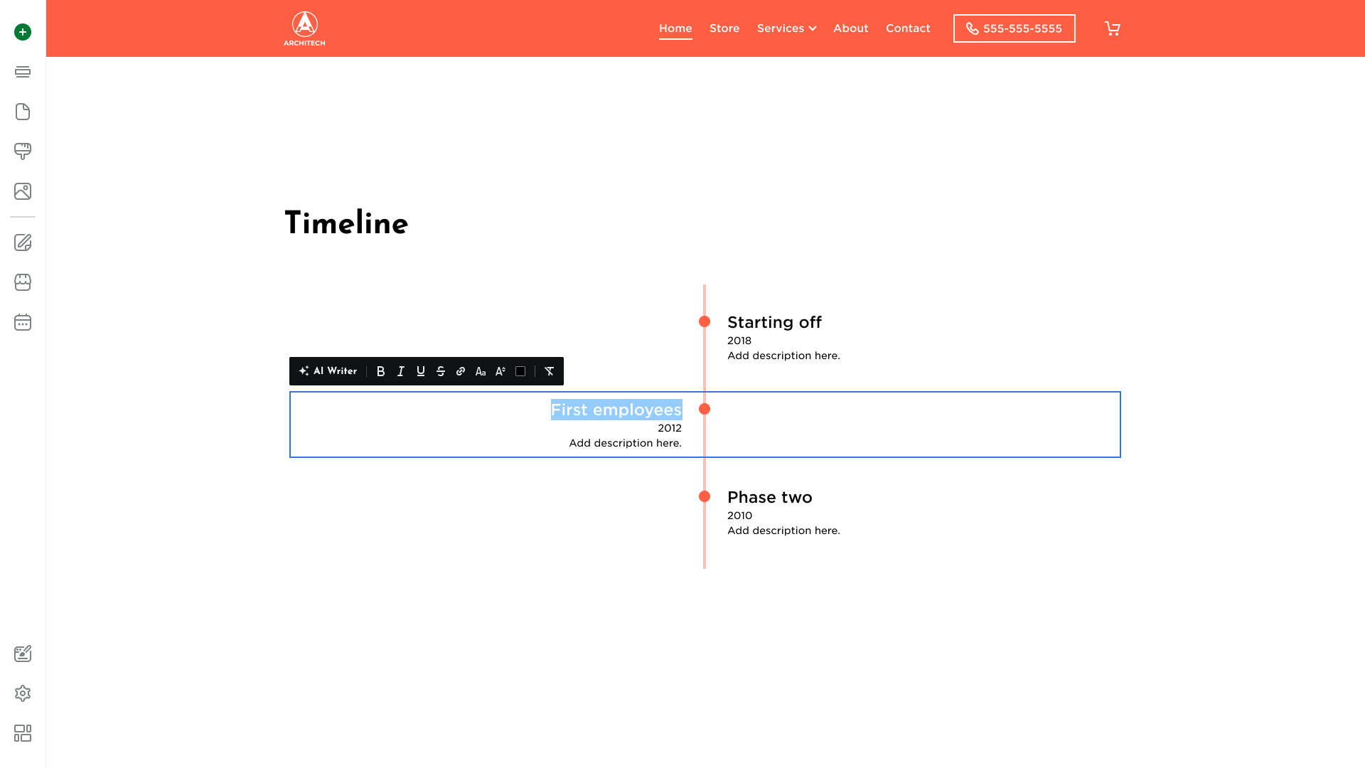 - Select a text to display the Editing Menu to use the AI Writer, make the text bold, italic, underlined, or strikethrough, and choose the font, text size, color, or clear the format of the selected text: