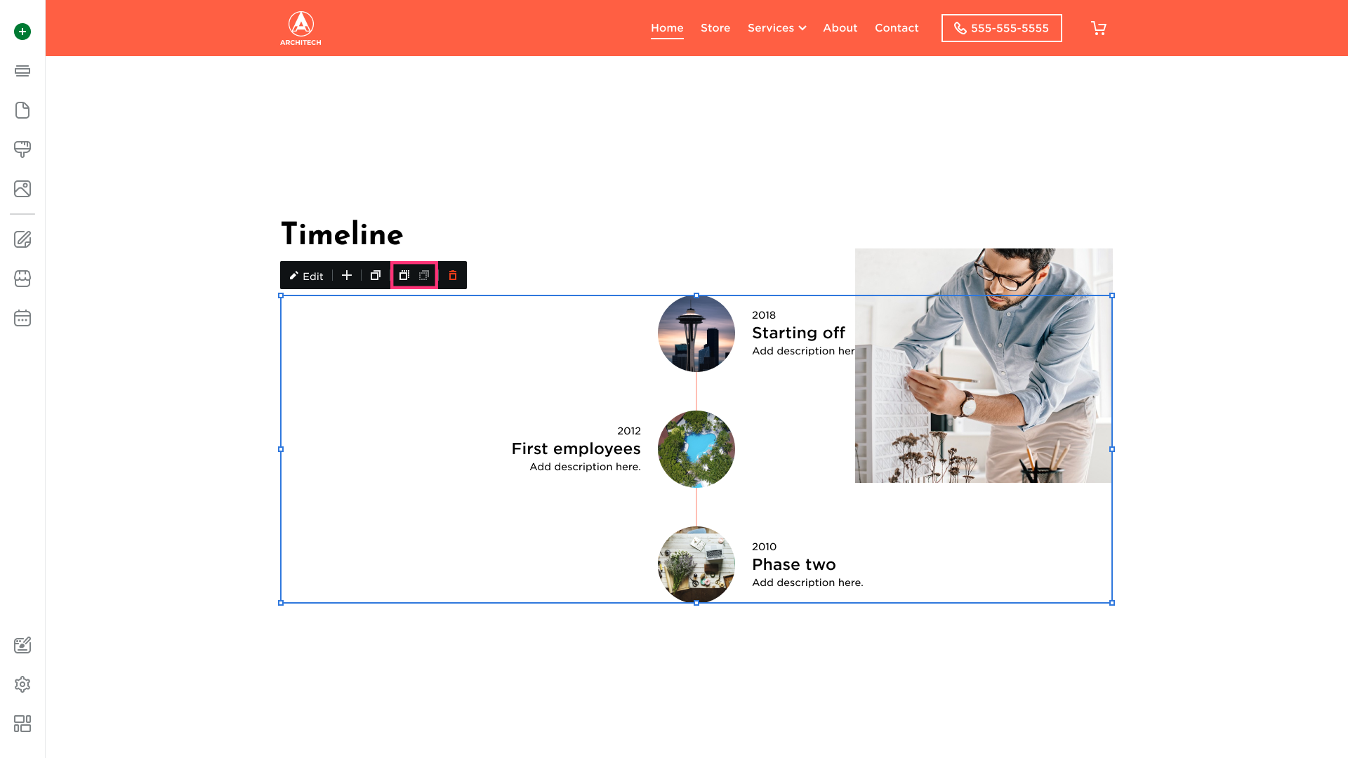 To edit, add the item, duplicate, layer or delete the element, click on it and switch between the buttons that appear in its toolbar: