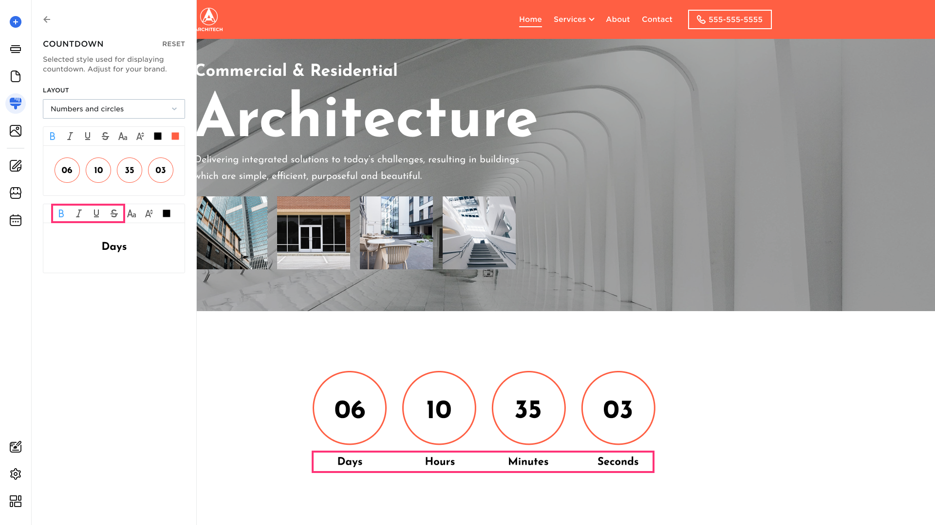 - Text Formatting. Make countdown text bold, italic, underlined, or strikethrough (selected options are highlighted in blue).