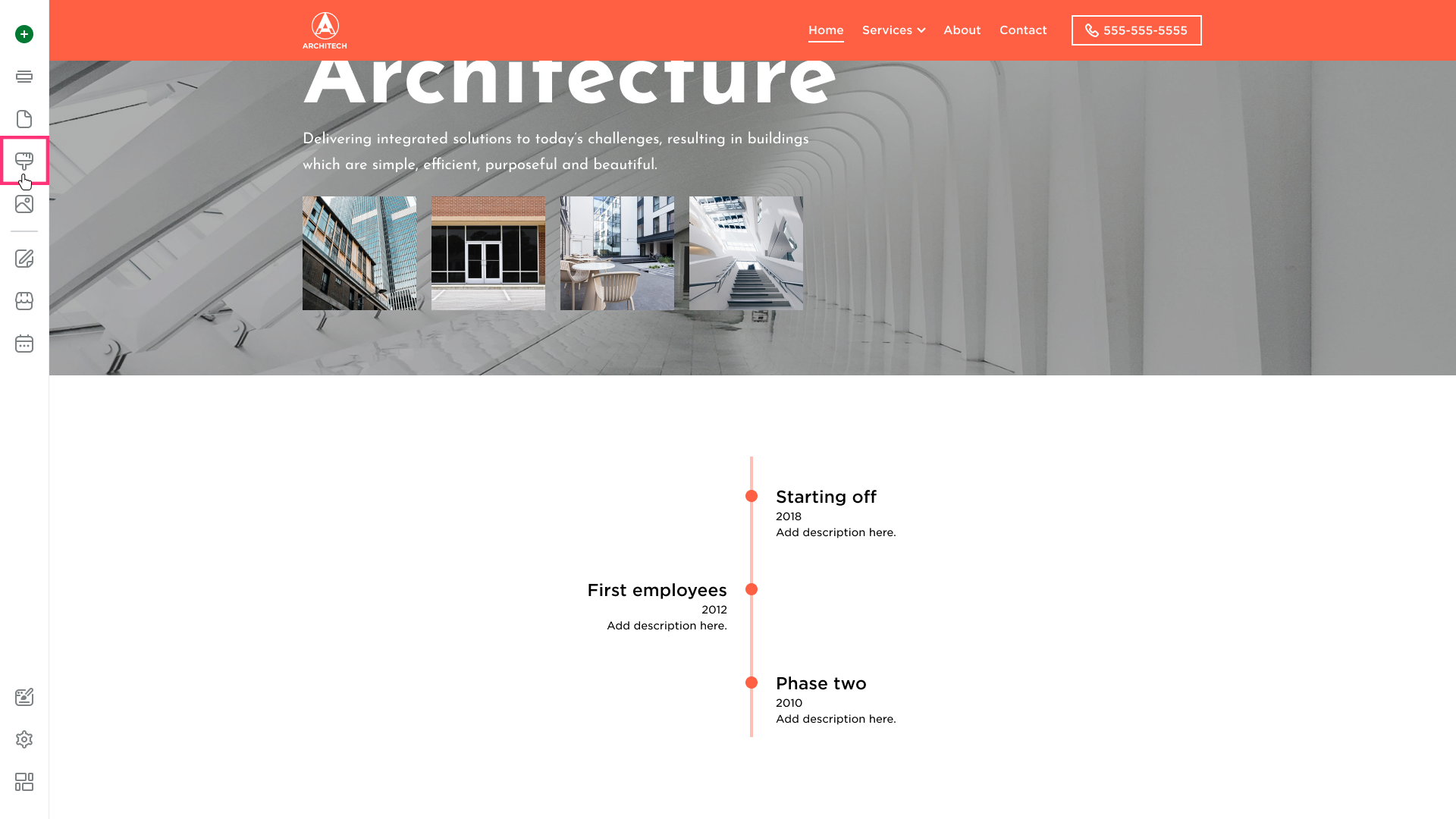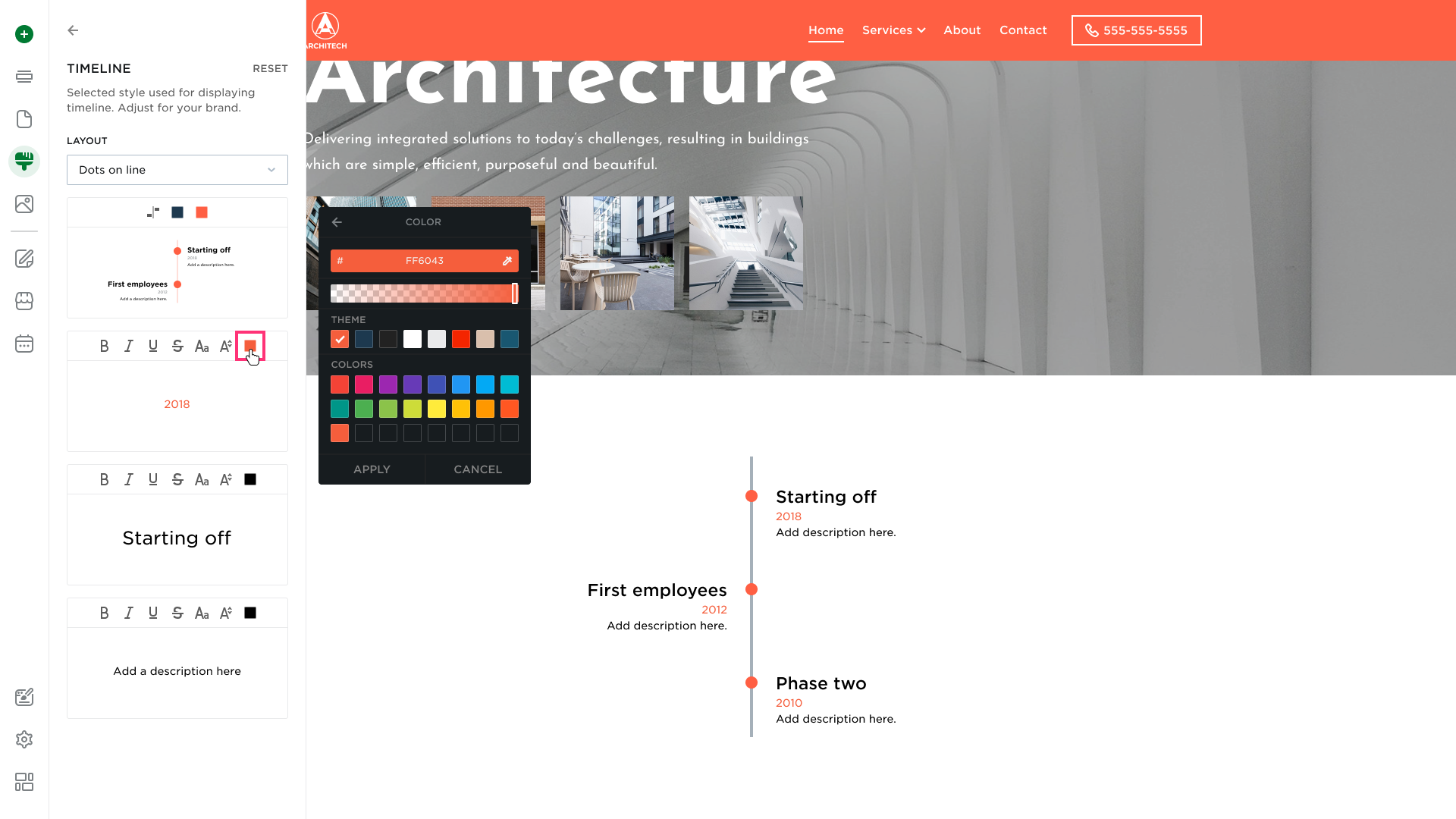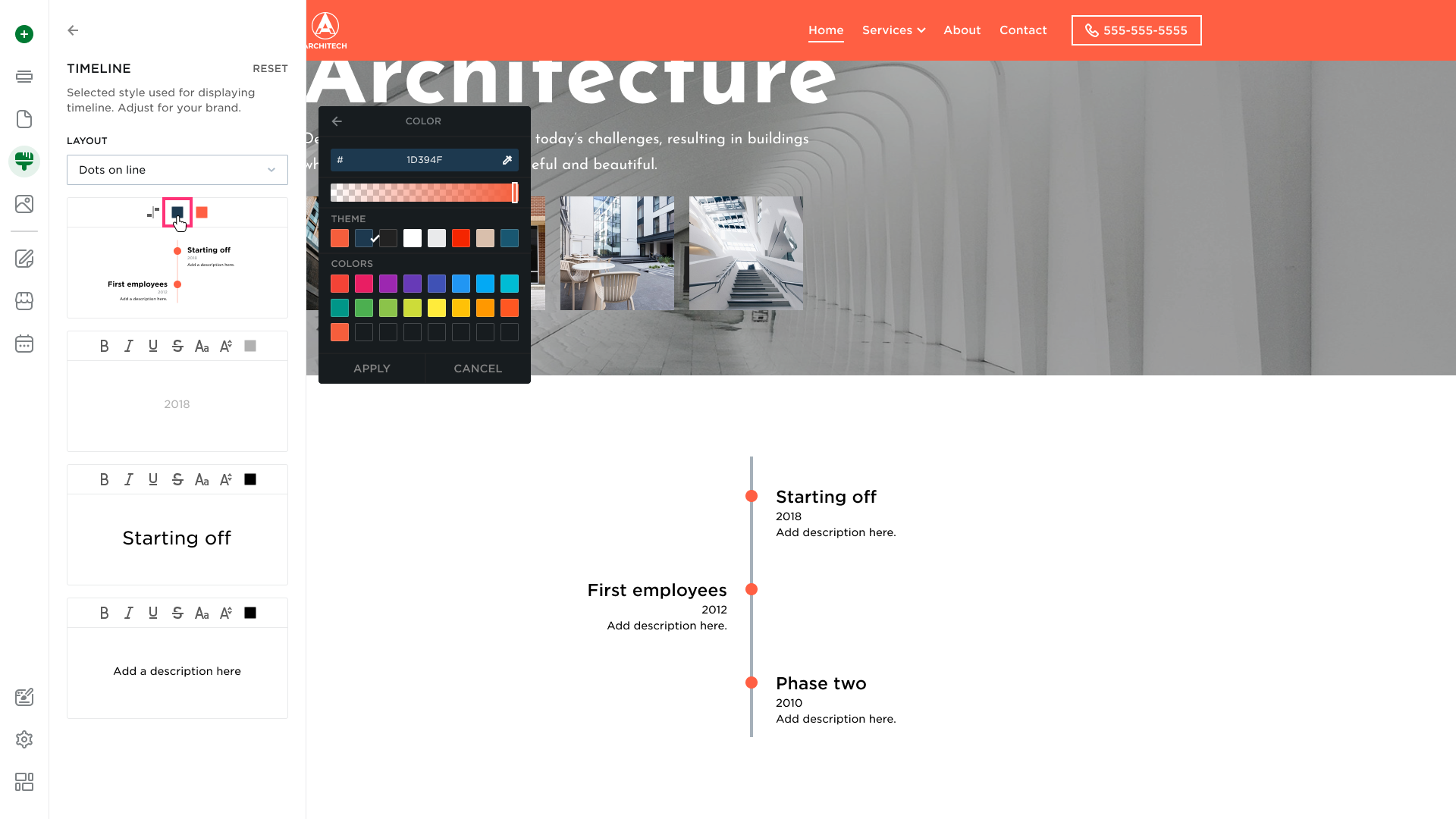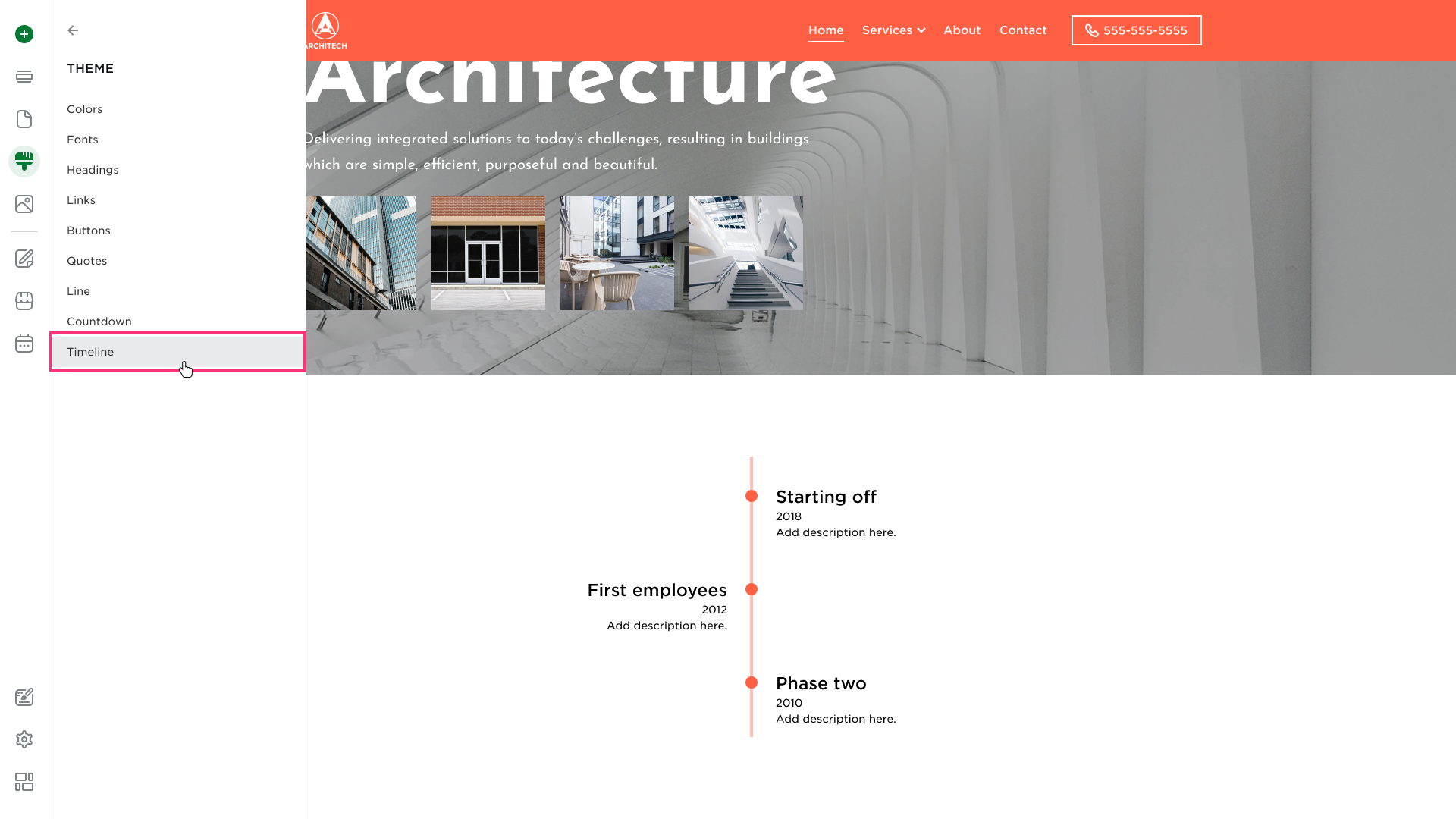 The Timeline element helps you organize content chronologically, helping visitors understand your business's development, progress, and key events. In the Site Editor, you can easily customize timeline settings to match your preferences.