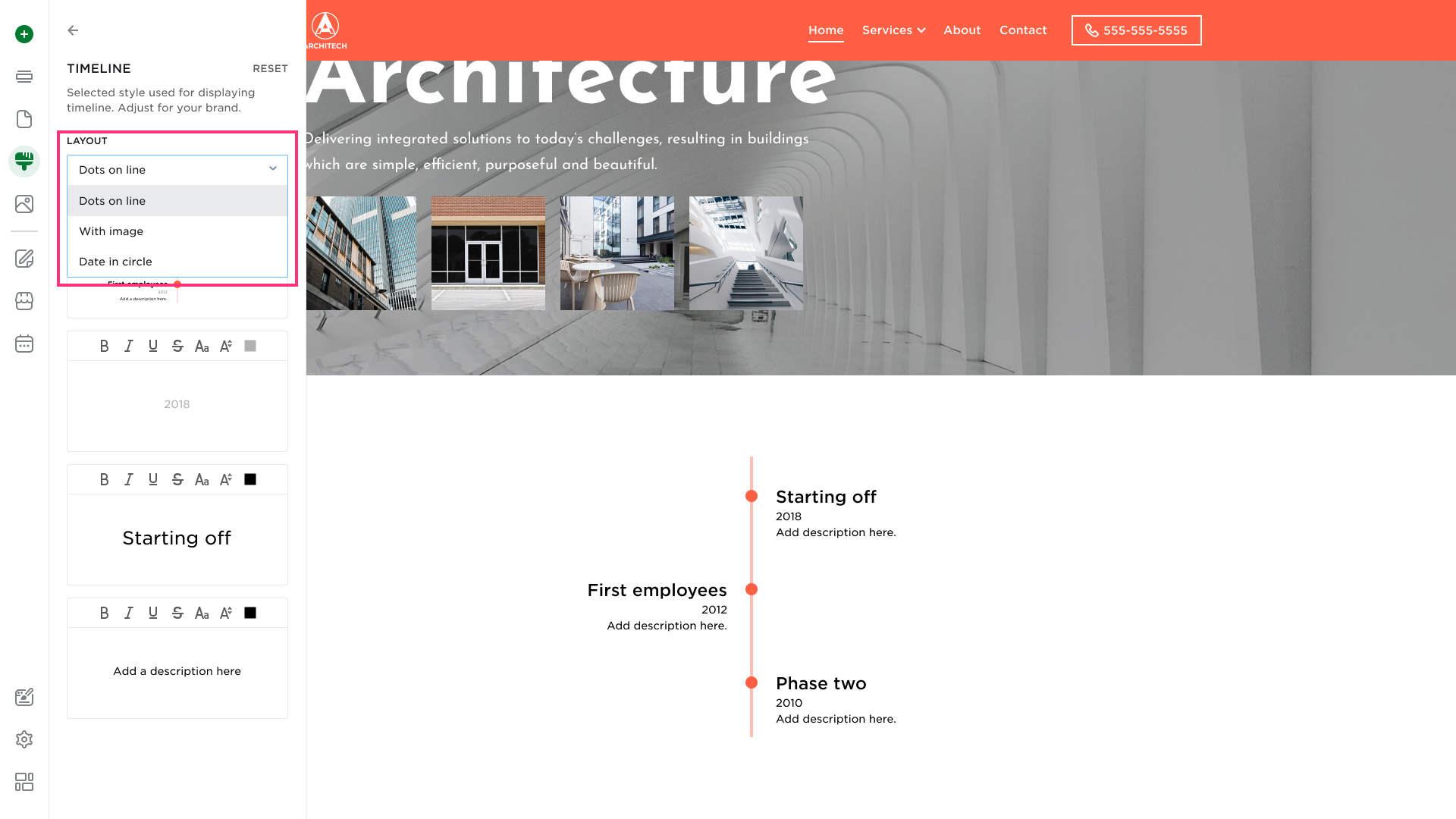 - Layout. You can customize timeline by its layout: Dots on Line, With Image or Date in Circle.