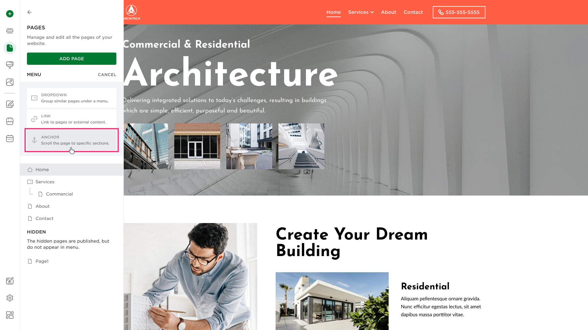 - An Anchor will immediately appear in the Navigation Menu and the Menu section in Pages: