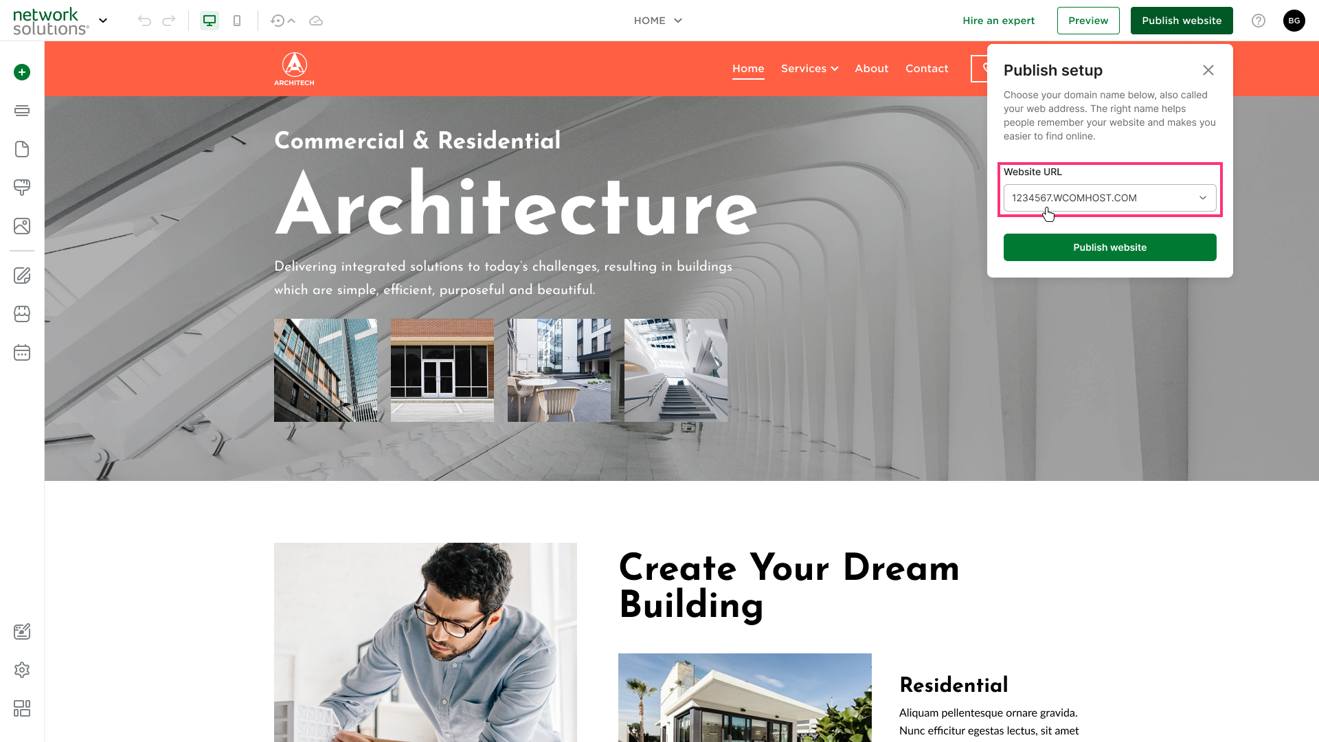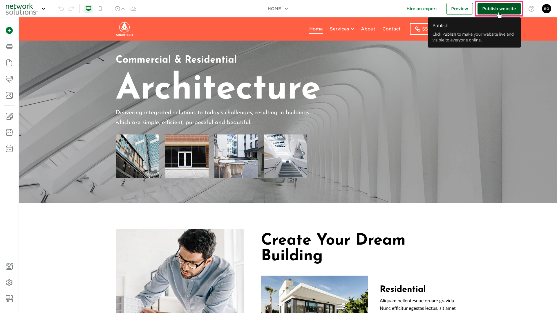 Once your domain is set up in the Account Manager, you can return to the Site Editor and hit the Publish Website button to go online: