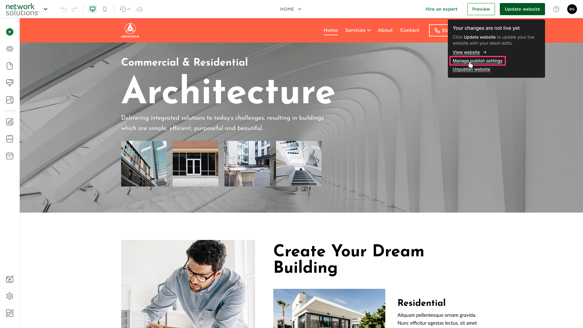 - If you would like to publish the project to a different domain, please hover over the Published Website/Update Website button and click Manage Publish Settings to select a different domain from the drop-down.