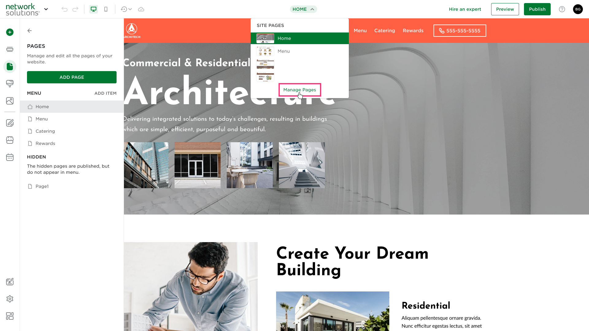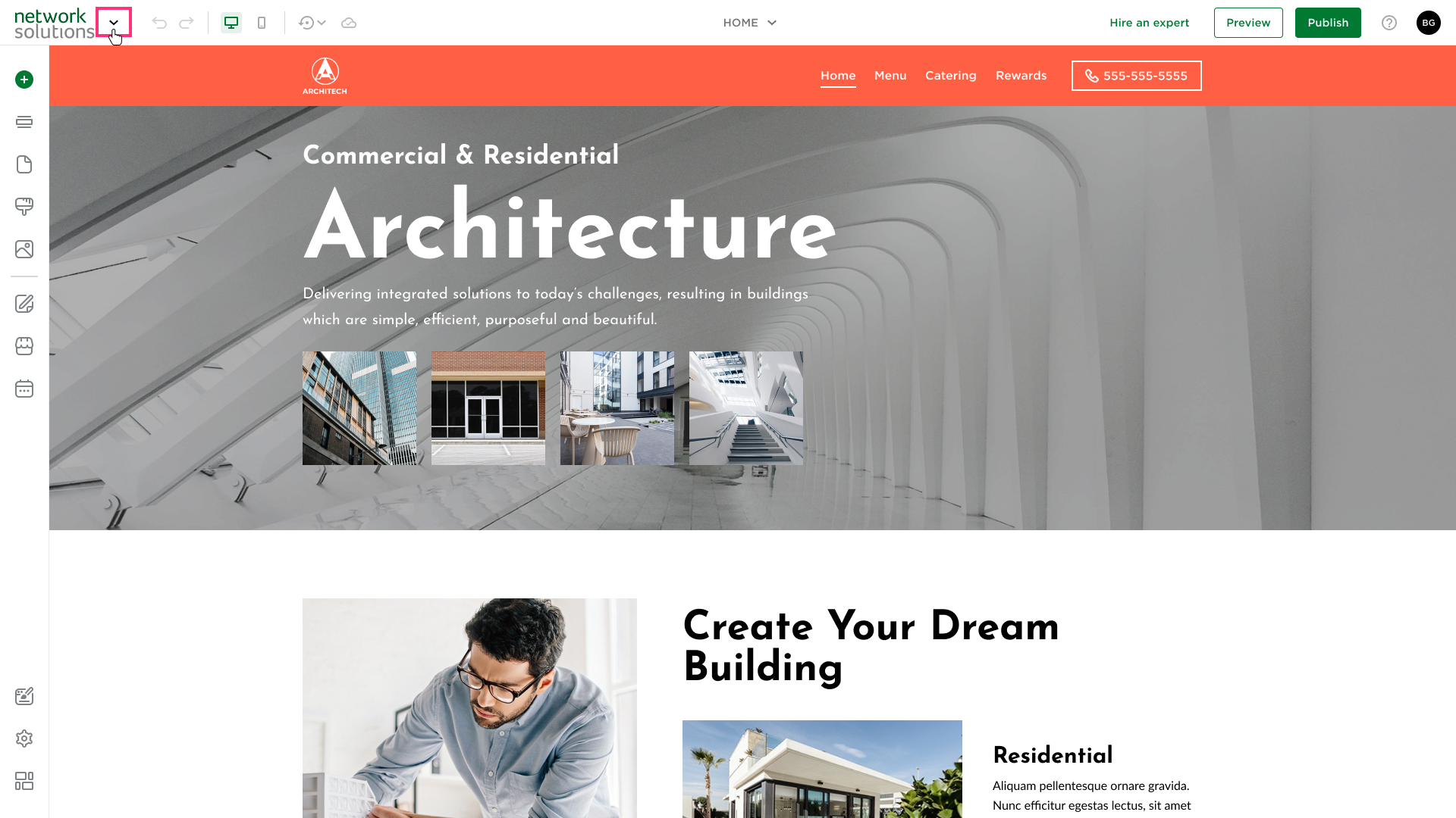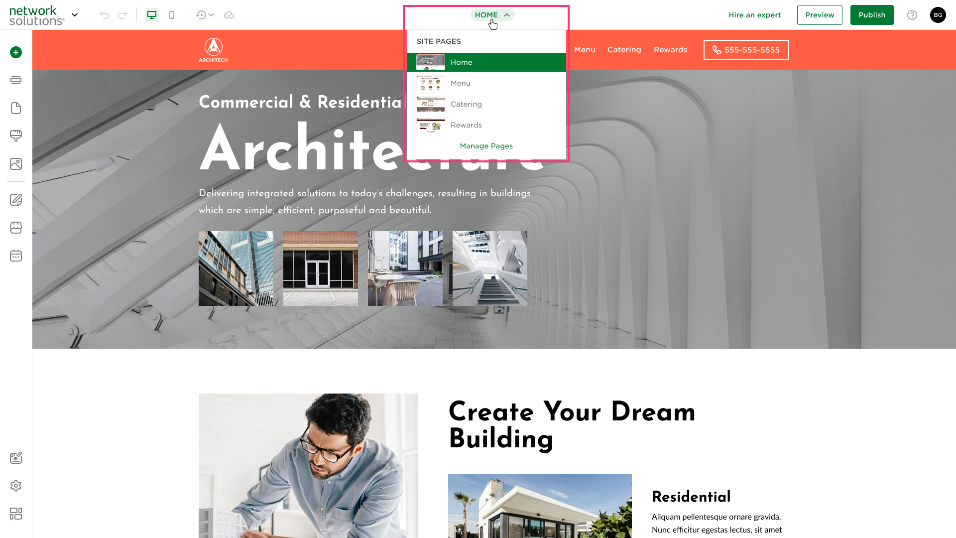 Click on the Pages drop-down to see your current location and navigate to other pages of your website:
