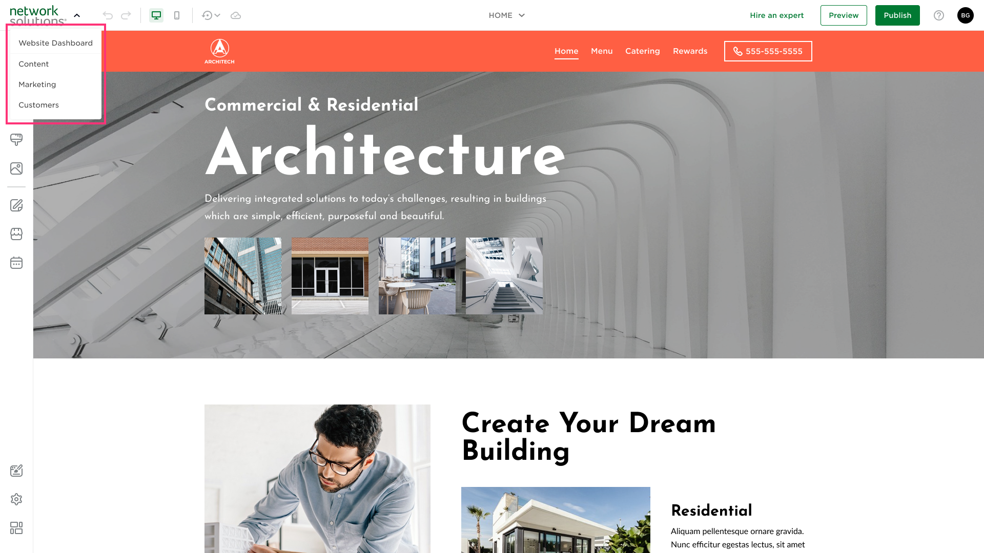 From the Main Menu, you can access the Website Dashboard, Store, Appointments, Content, Marketing and Customers section: