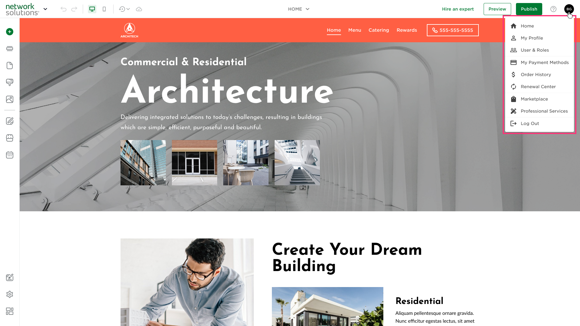 Click the Account (your initials) icon in the top-right and select among the following options: Home, My Profile, User & Roles, My Payments Methods, Order History, Renewal Center, Marketplace, Professional Services or Log Out:
