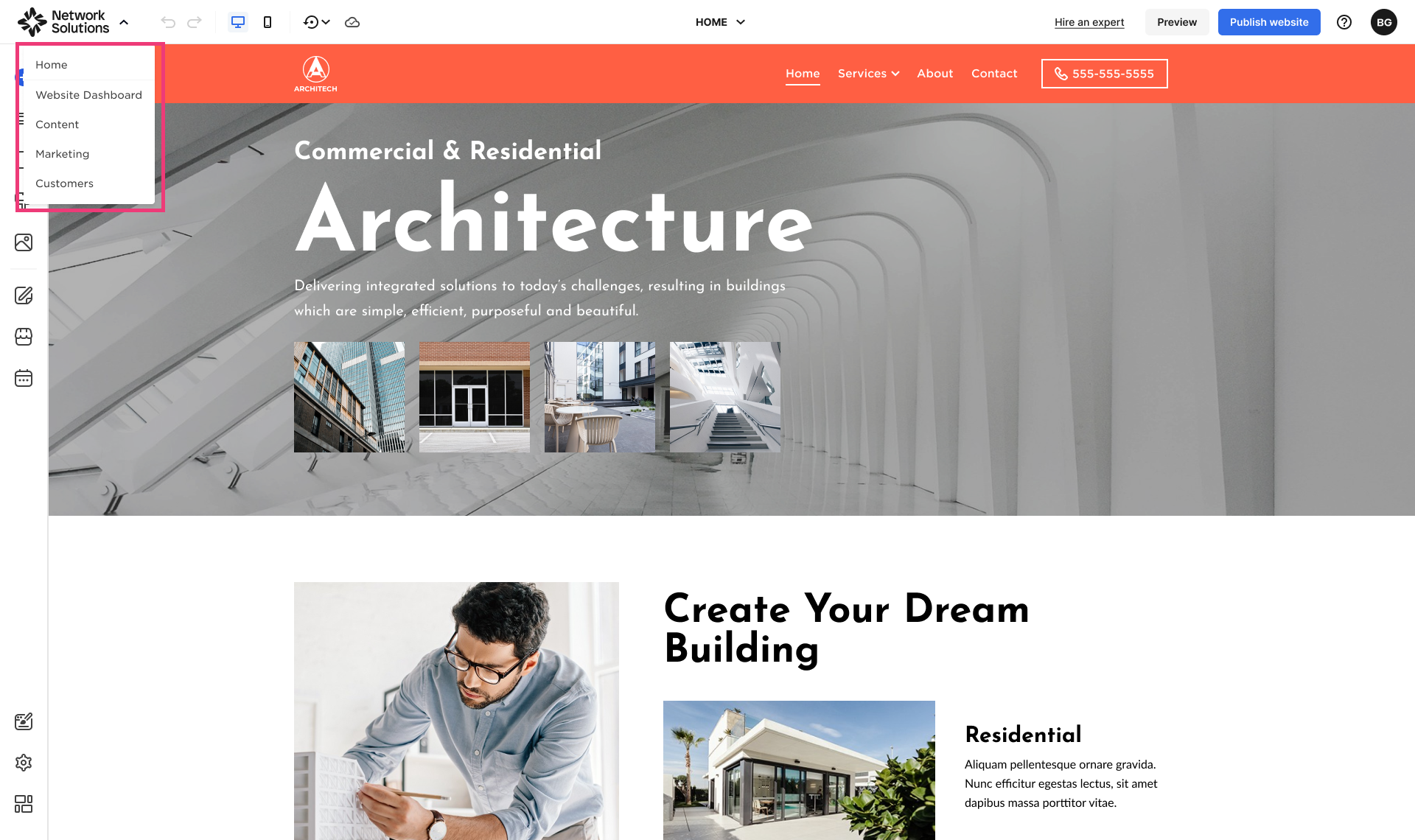 From the Main Menu, you can access the Account Manager Home page, Website Dashboard, Content, Marketing and Customers section: