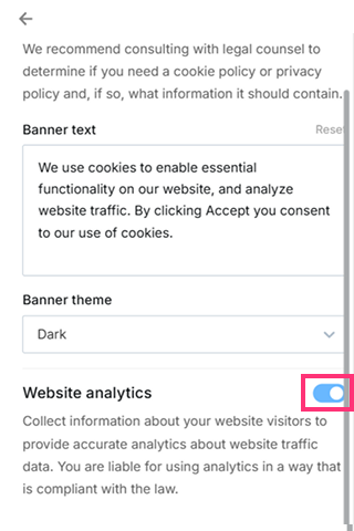 - The Website Analytics functionality is disabled by default. Switch the toggle to enable the Website Analytics: