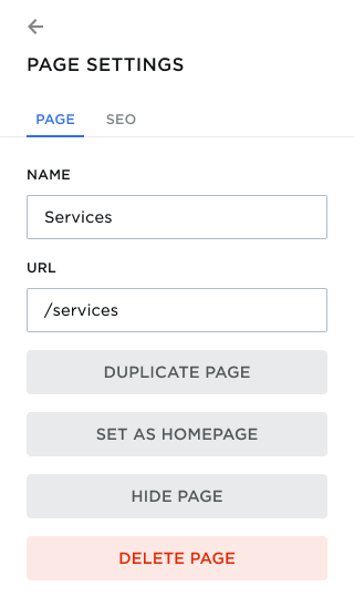 The Page Settings panel allows you to modify basic information about your website pages, including the name, URL, title, description, and social share image. You can also remove, hide, or set the selected page as the homepage.