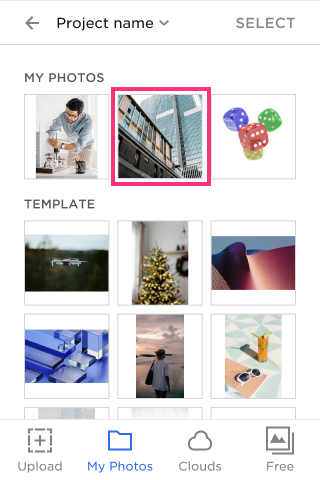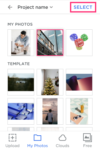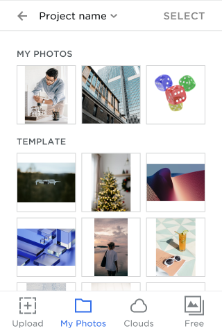 - A dialog with different options to upload photos will open (Upload from your device, add from My Photos or Clouds, or use Free Photos):