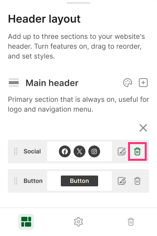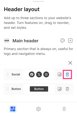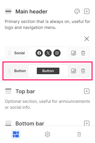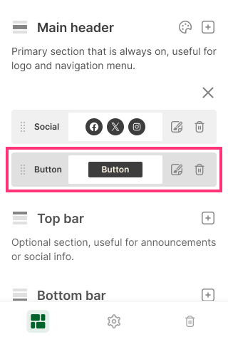 Please Note: You can add up to two Buttons to each Header section. All other elements: Social, Slogan, and Menu are limited to one per section. A Slogan can be added either to the Top bar or the Bottom bar.
