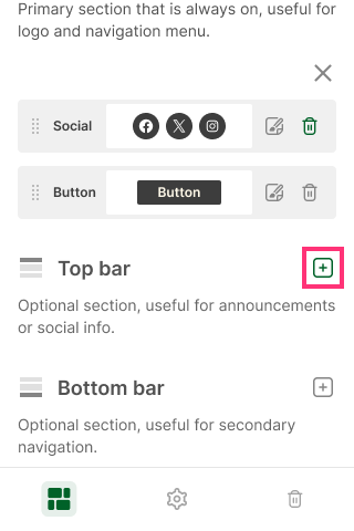 Top Bar is an optional section that initially is empty. The section will appear on the website after you add elements: