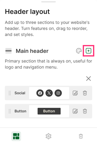 - Add Header elements (Social, Button, Slogan or Menu) by tapping the Add Element button: