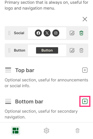 Bottom Bar is an optional section that initially is empty. The section will appear on the website after you add elements: