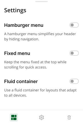 - Locate the section and click the Settings button on the Navigation Header Menu to open Settings. Turn on or off the Hamburger, Fixed Menu or Fluid Container options: