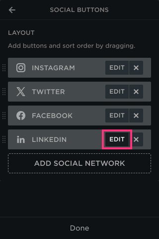 - In the Social Buttons dialog, locate the social you want to modify, and tap Edit on its right: