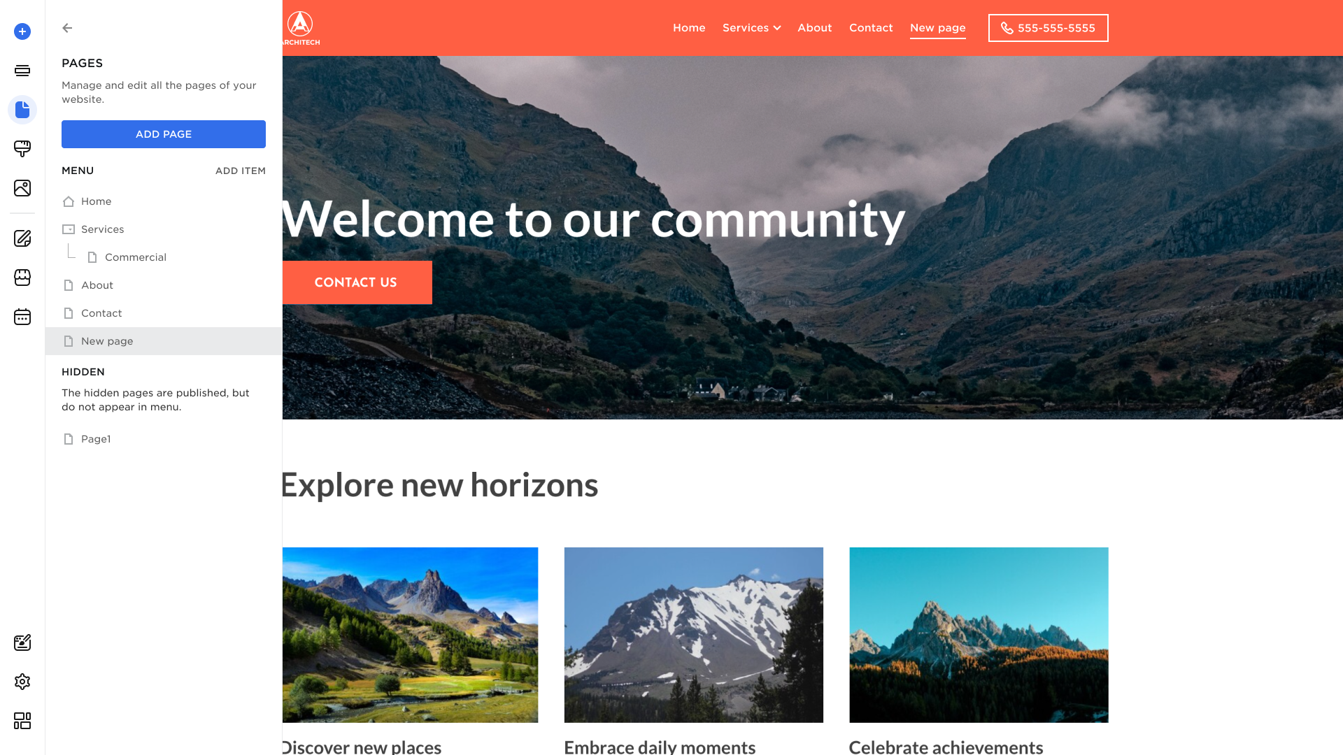 - The new page will immediately appear in the Navigation Menu and the Menu section in Pages: