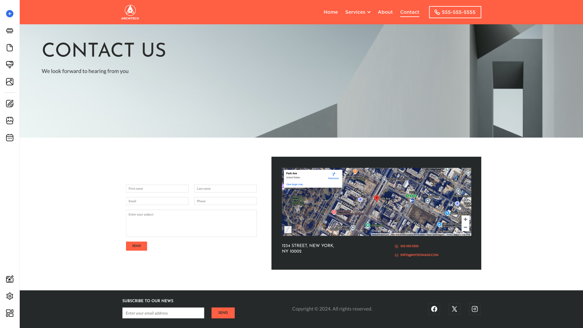 The Contact page gives visitors easy ways to get in touch with your business. Include contact information, such as your address, phone number, email address, and working hours, and pin your address on a map if applicable. Customize a contact form for visitors to submit inquiries about your products or services directly.