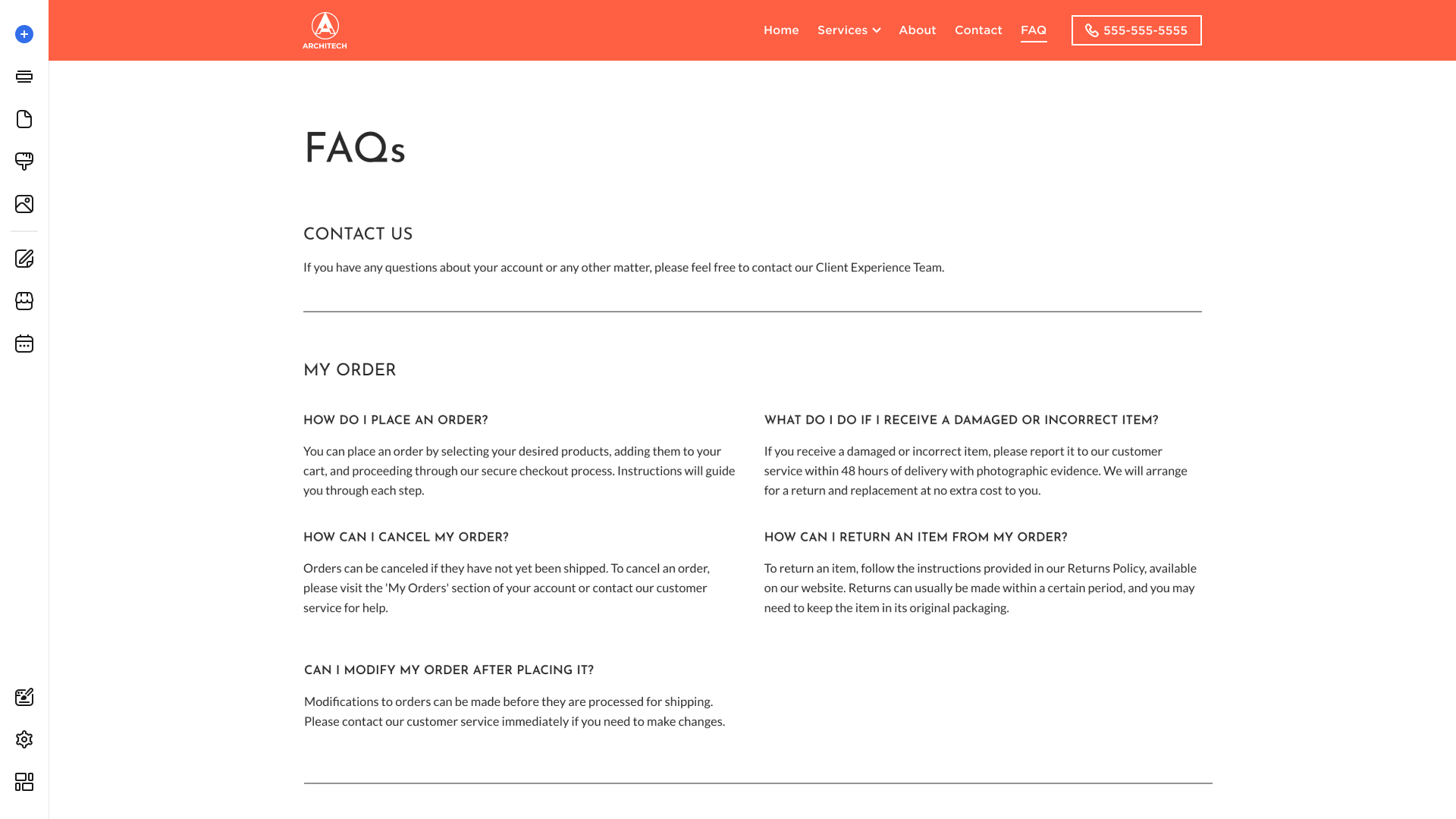 The FAQs page is dedicated to answering common questions and concerns that customers may have about your products or services. You can reduce customer frustration and increase satisfaction by providing quick and easy answers to frequently asked questions.