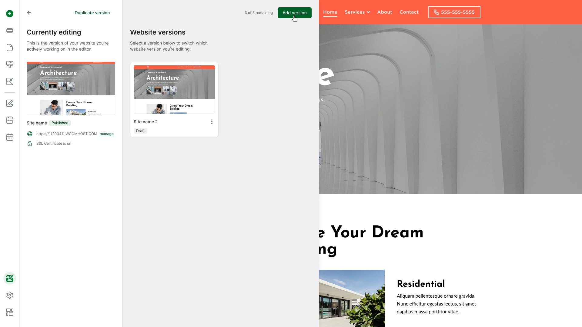 Switch between your websites and manage them in one place directly in the Site Editor. All the Website functionality currently available in the Website Dashboard will also be available in the Site Editor: rename, duplicate, delete your website versions, and assign domains in the Website Versions section.
