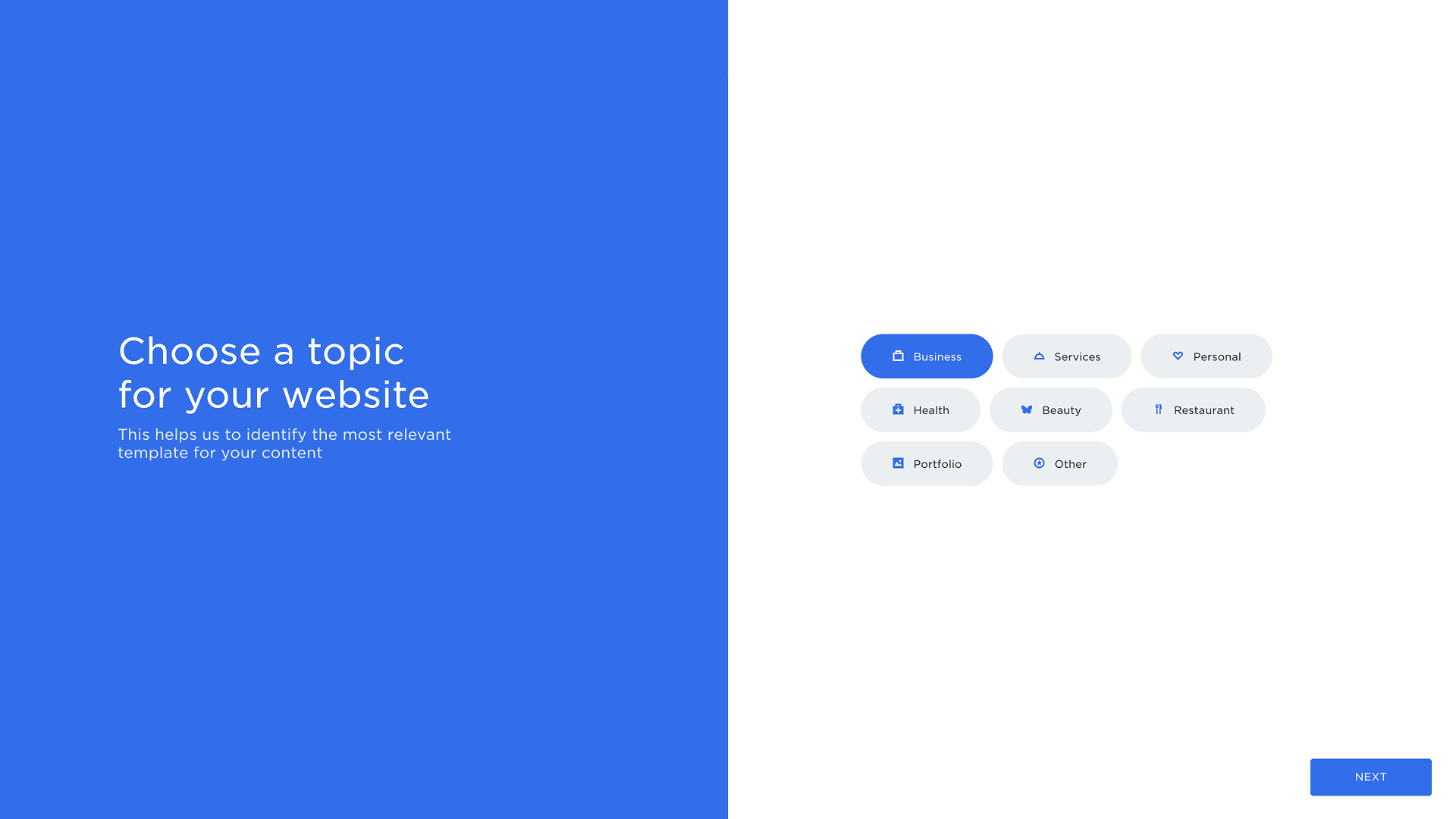 - Choose a topic for your website. The most relevant template will be identified for your content. Select Next: