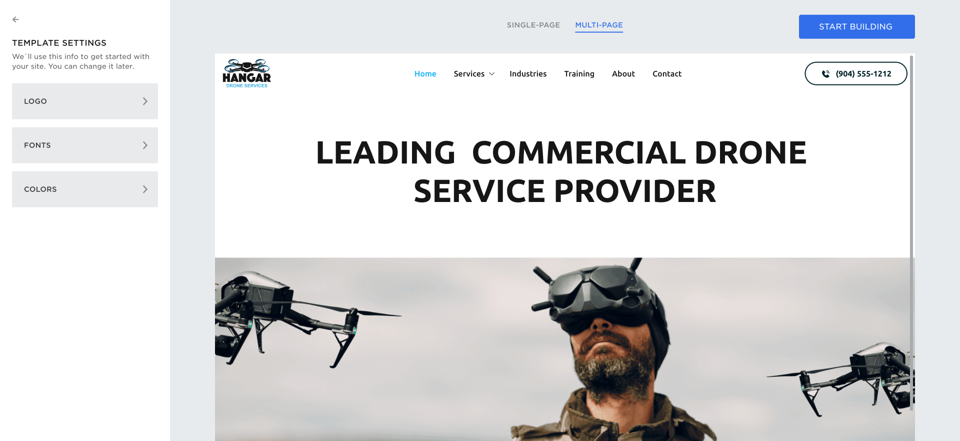 - A template preview with personalized info will appear. Here you can review information, set up general Fonts and Colors, and edit or add your Logo. To move to the next steps, click Start Building on the top right.