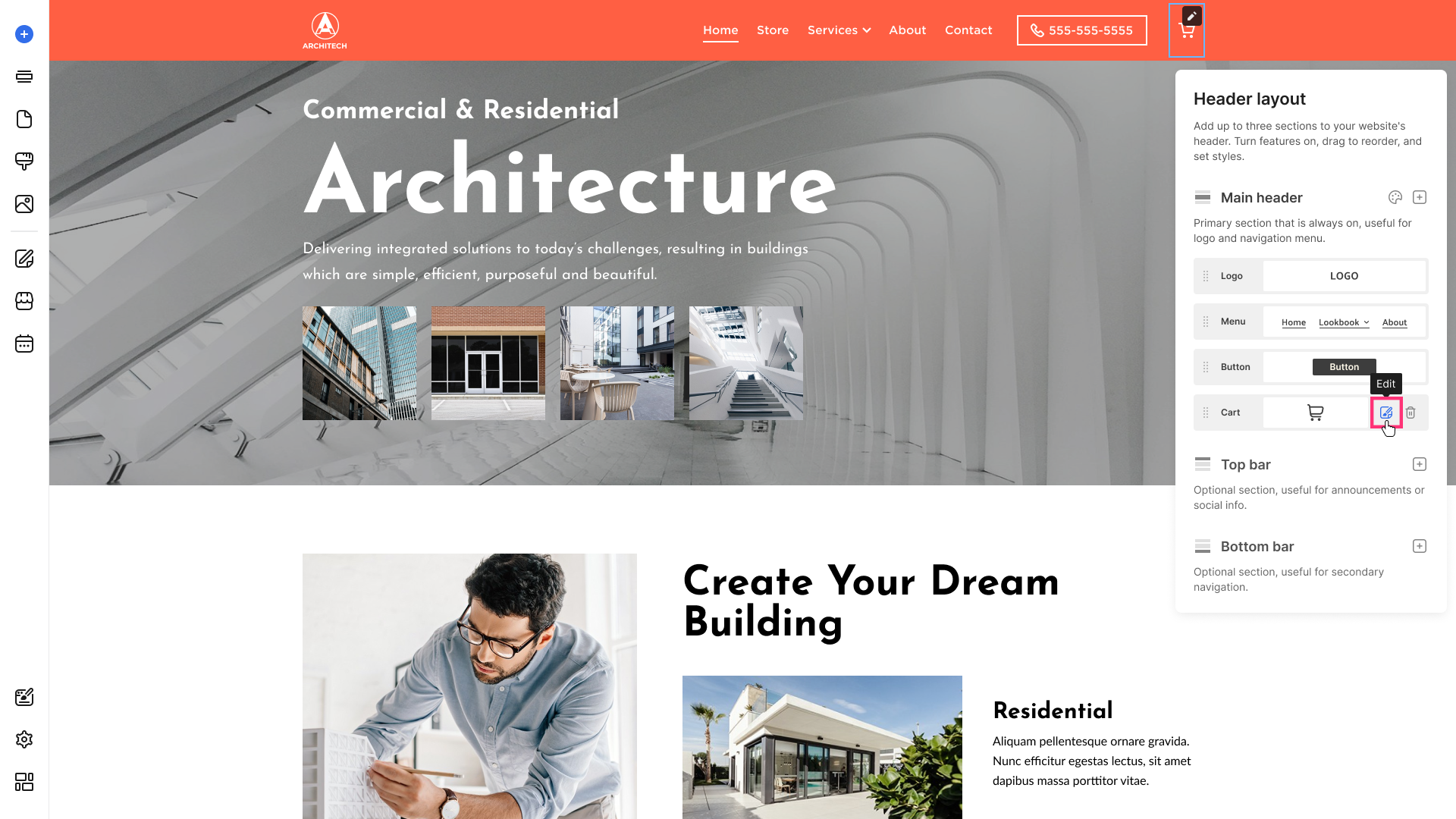 - If the Shopping Cart is enabled, you can access the settings by hovering over it and clicking the Pencil icon: