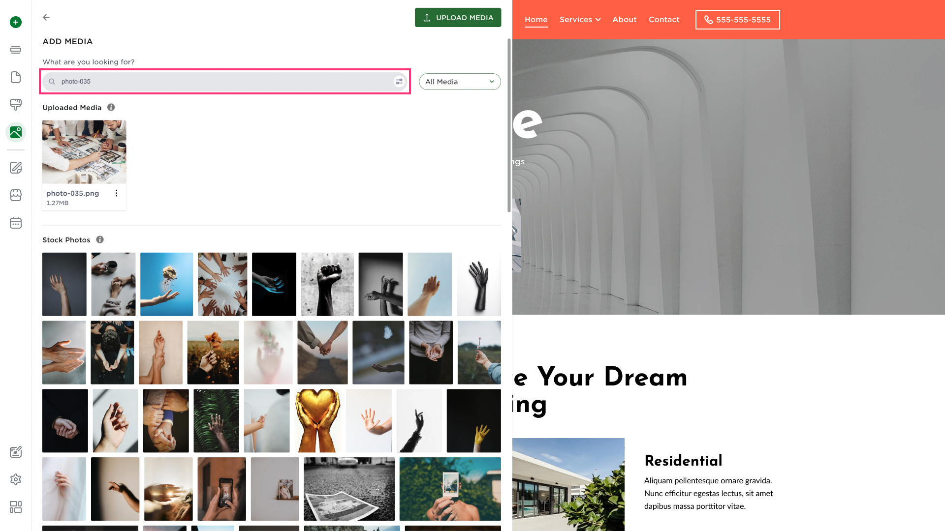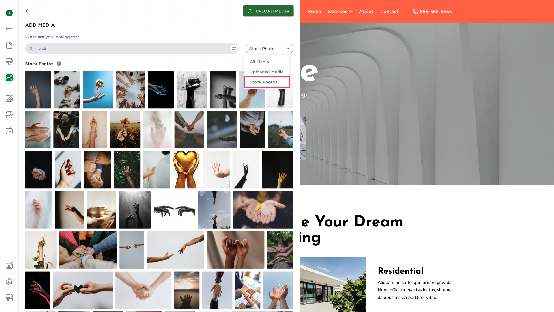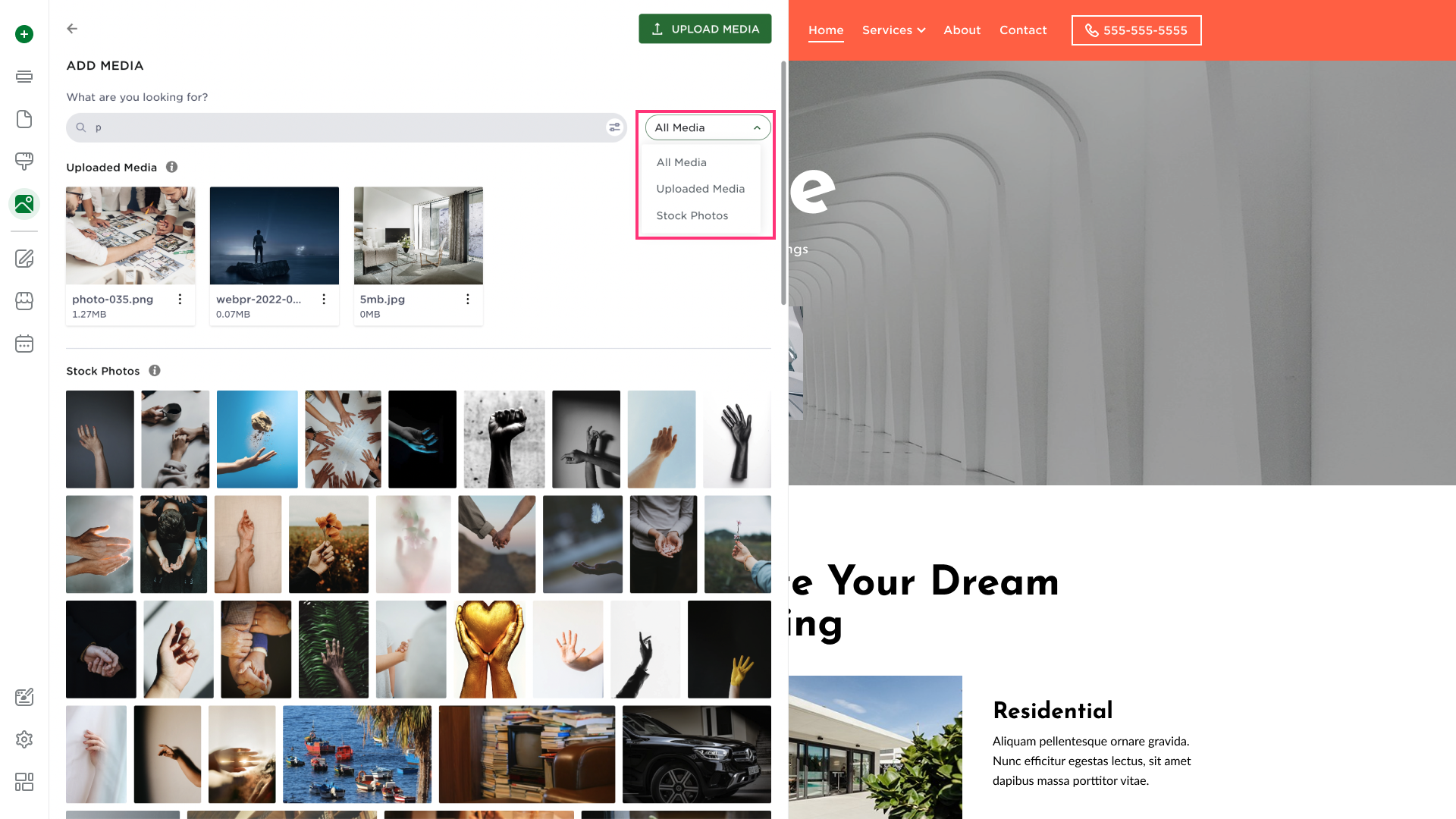 - You can search photos among All Media in the Library or select Uploaded Media or Stock Photos only using the dropdown: