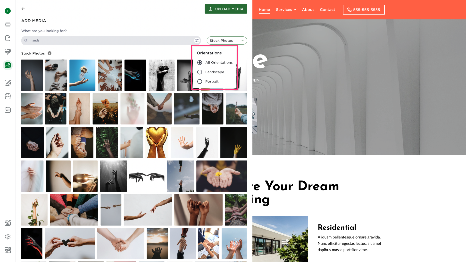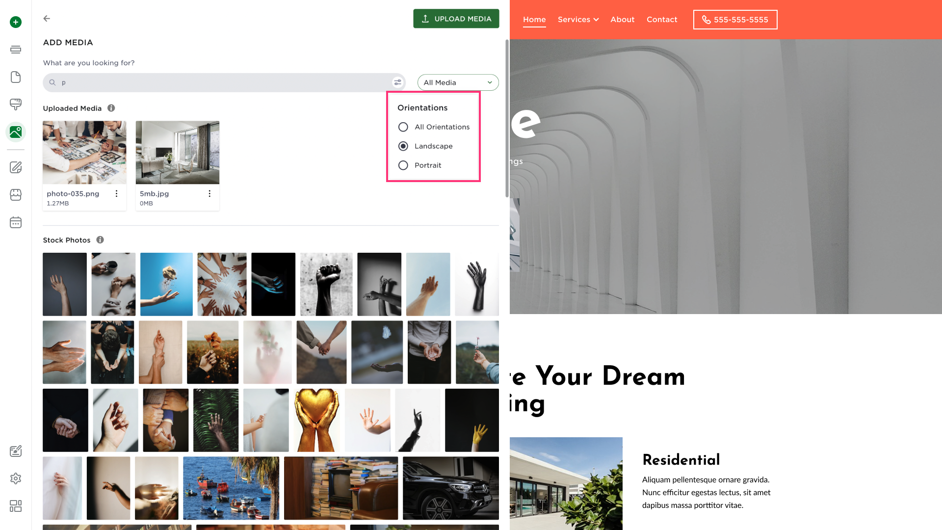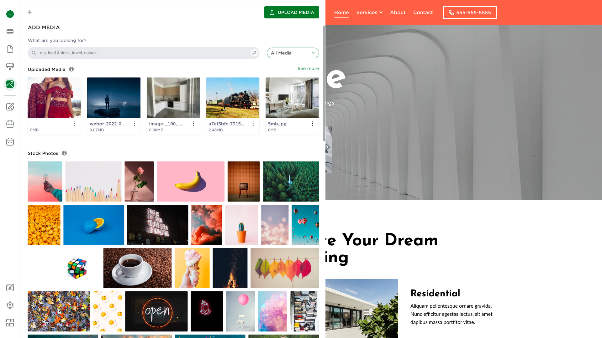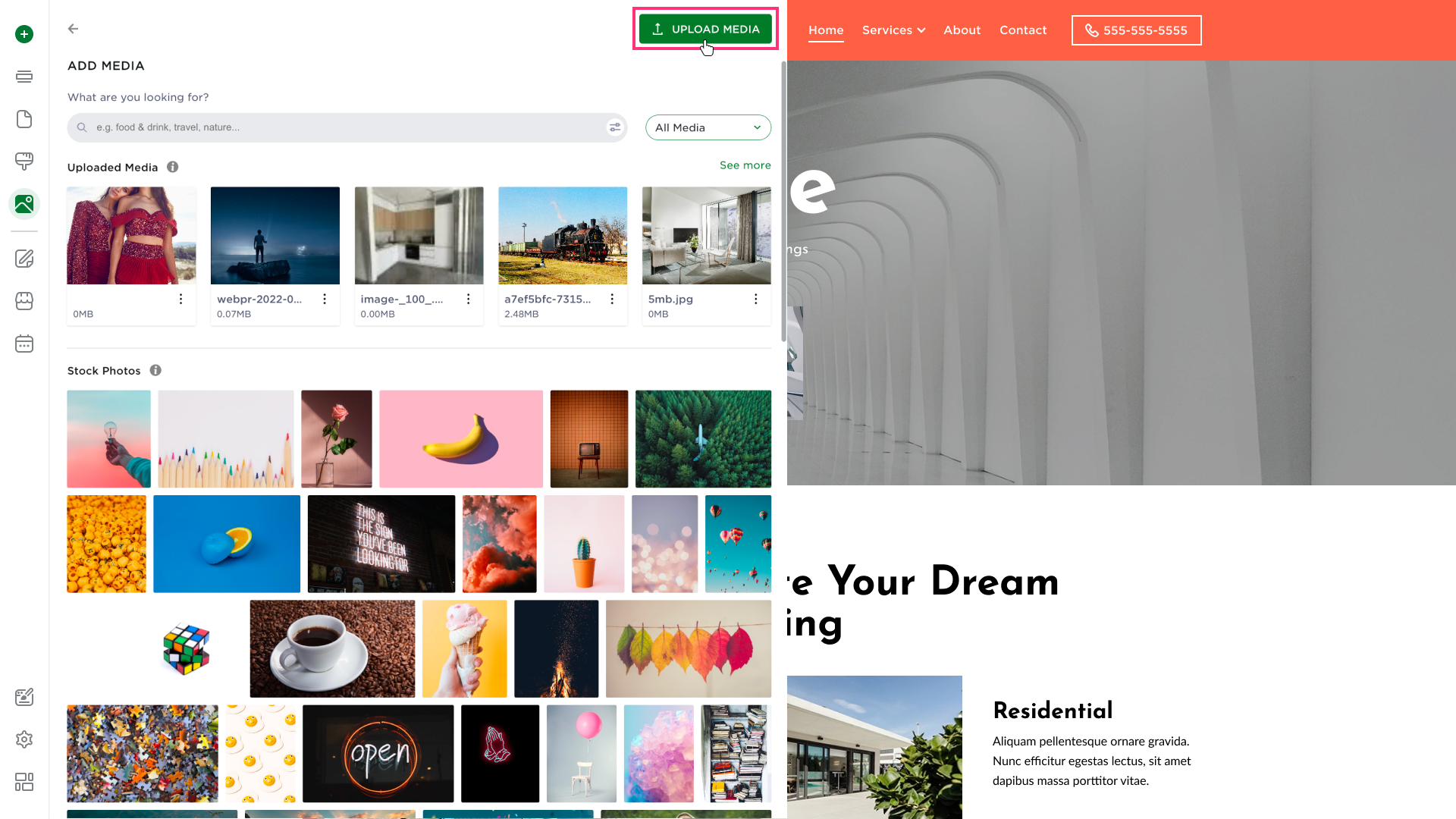 - You can search photos among All Media in the Library or select Uploaded Media or Stock Photos only using the dropdown: