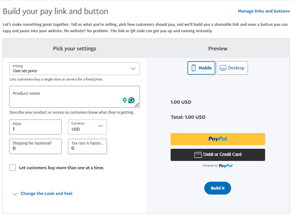 - Pay Link or Button: Perfect for regular or "Buy Now" transactions. Features like price, currency, and quantity options are customizable for users.